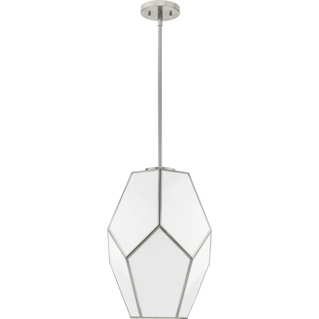 Charmingly distinctive, the Latham Collection glows from within. The Pendant Light is composed of a geometric framework that features an artful array of handmade art glass. Inspired as a modern expression of an origami lantern, the light delivers striking illumination to spaces below.Features:Dimensions:Electrical Specifications: