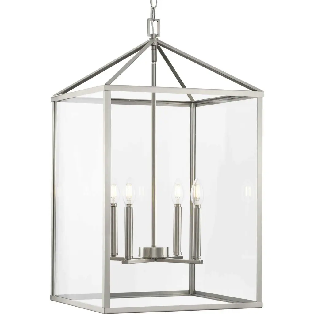 The Hillcrest Foyer Light interprets the traditional carriage light for the modern age, giving it a fresh update with a refined angular silhouette. A classic candelabra base is suspended within a beveled glass frame. Clear illumination is cast from its airy design.Features:Dimensions:Electrical Specifications: