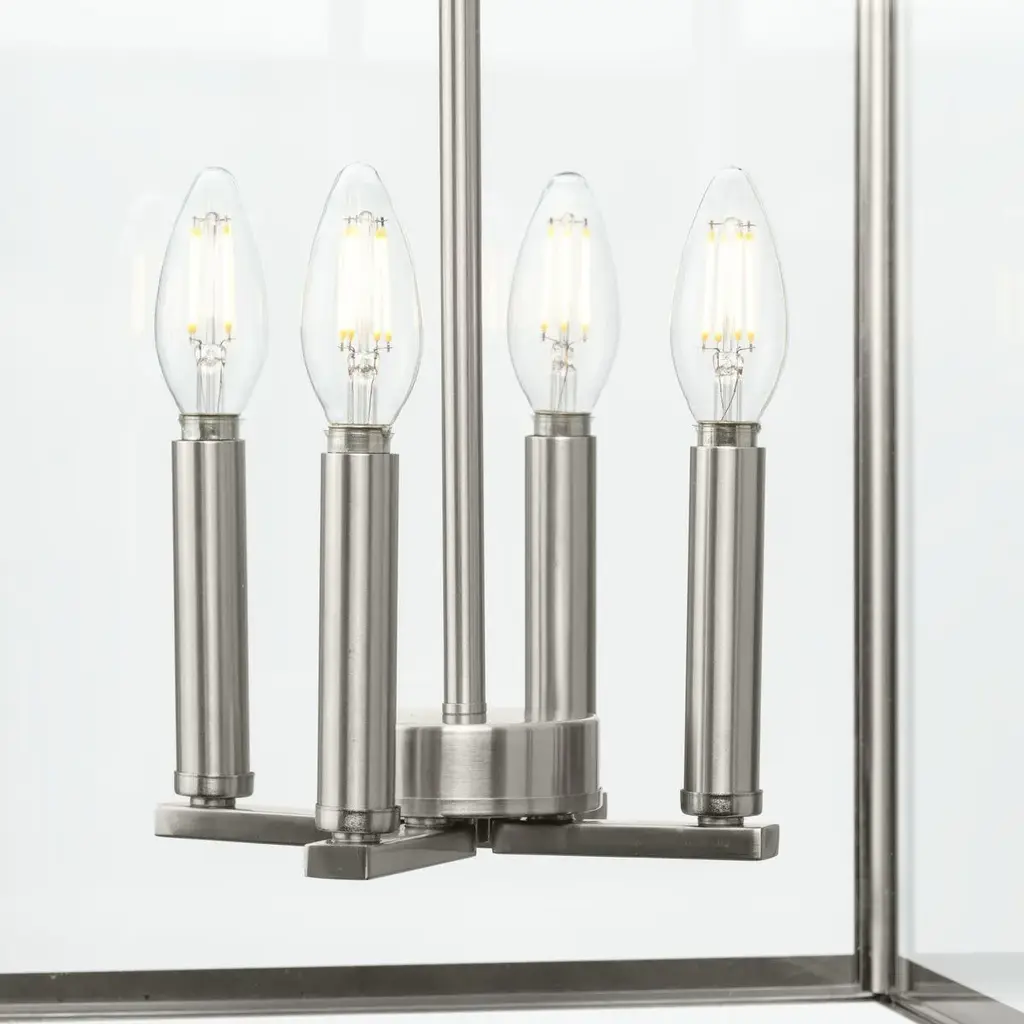The Hillcrest Foyer Light interprets the traditional carriage light for the modern age, giving it a fresh update with a refined angular silhouette. A classic candelabra base is suspended within a beveled glass frame. Clear illumination is cast from its airy design.Features:Dimensions:Electrical Specifications: