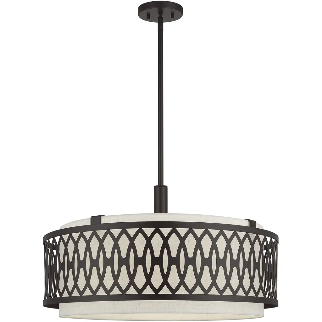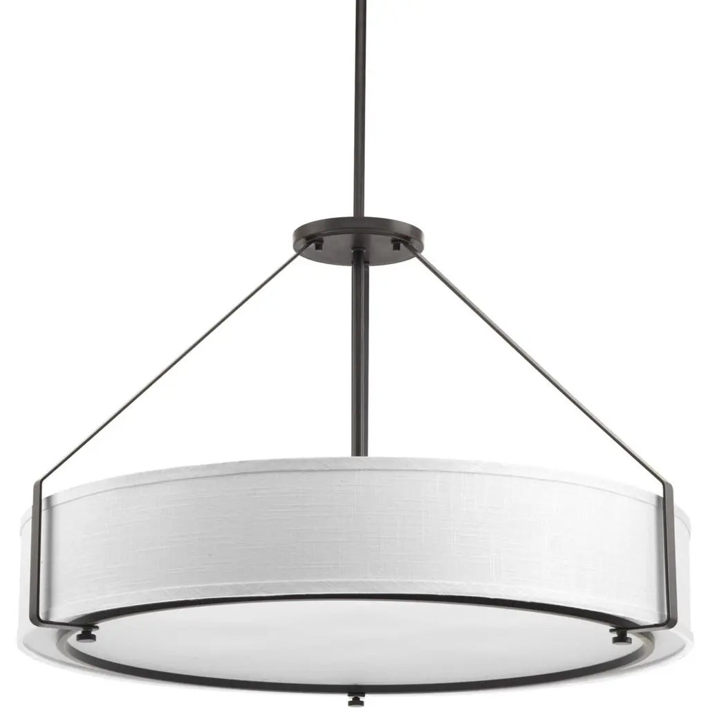 Introducing the Ratio Collection from Progress Lighting, featuring the sleek and modern four-light pendant. Crafted from durable steel with an elegant Antique Bronze finish, this pendant boasts a width of 24" and a height of 15.88". The included 8" chain allows for customizable hanging length. The pendant is designed for incandescent lighting with a wattage of 75 watts, offering a warm and inviting glow. The dry rated moisture rating ensures safe use in indoor spaces. The low-slung white linen drum shade is perfectly proportioned to the metal frame, creating a harmonious balance of style and function. The polished glass exterior and etched glass interior diffuser add an elegant touch and are easy to clean. The pendant also includes a brushed nickel finish canopy, with a diameter of 5", and rod lengths of 1-6 and 4-12 for added versatility. Elevate your space with the Ratio pendant, a perfect blend of modern design and practicality.
