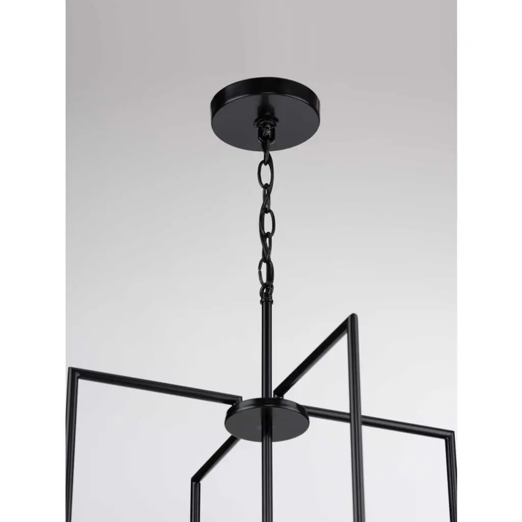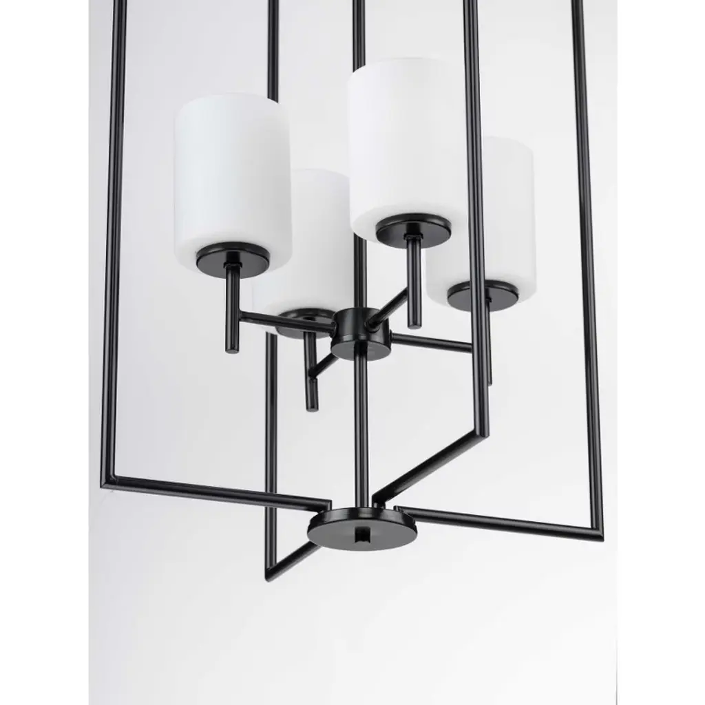 Introducing the Replay four-light foyer pendant from Progress Lighting. This stunning fixture from the Replay collection features clean, simple lines and is crafted from durable steel with a sleek black finish. The pendant measures 18" in width, 31.75" in height, and 18" in length, with a 72" chain length for versatile installation. It uses incandescent lighting with 4 bulbs and a wattage of 100 watts. The moisture rating is dry rated, making it suitable for indoor use. The design showcases two elongated, rectangular frames intersecting above and below etched glass diffusers, creating an elegant focal point. Perfect for transitional and modern interiors, this pendant is ideal for hanging in a foyer, over a dining table, or above a kitchen island. The canopy, measuring 5.13" in diameter, is included, and the shade dimensions are 3.88" x 3.88" x 5.13". Elevate your space with the timeless elegance of the Replay foyer pendant.