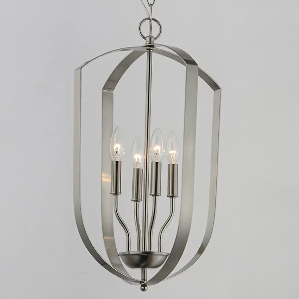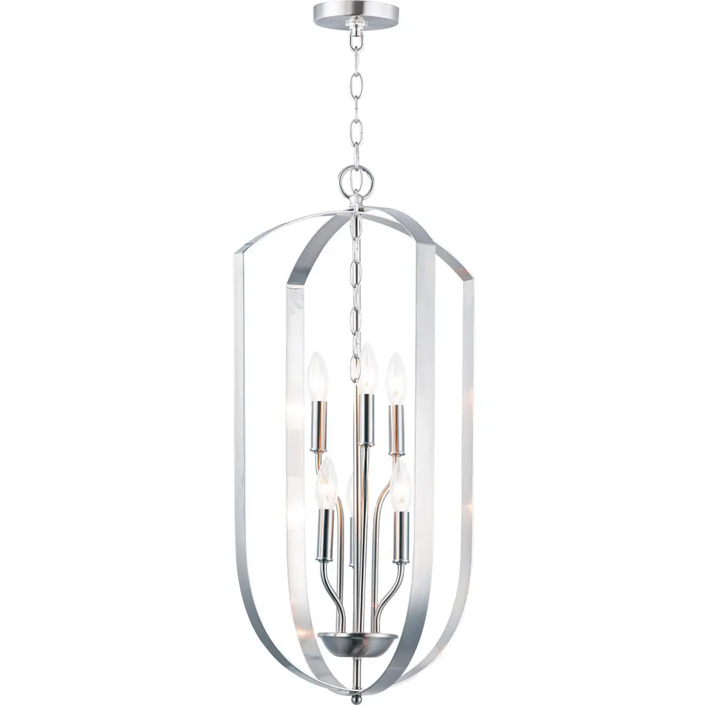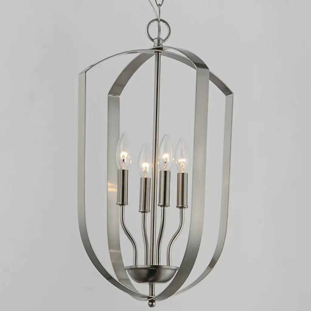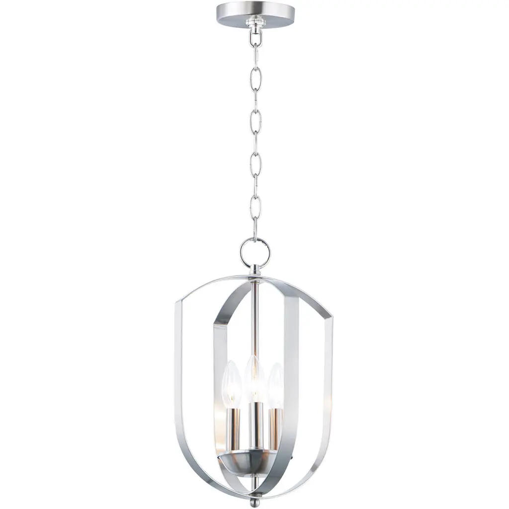 The Provident Pendant by Maxim Lighting is a handsome, airy design. Suspended from a round canopy by a linked chain, a decorative loop tops an openly styled frame made from slender metal bands that are gracefully curved, surrounding a set of exposed candelabras. A lovely finish dresses up the simple and sleek silhouette of this pendant as the lights within shine freely onto surroundings, offering spaces a bright, beautiful touch.