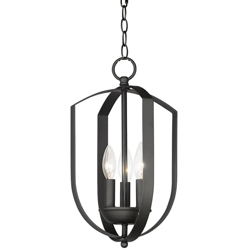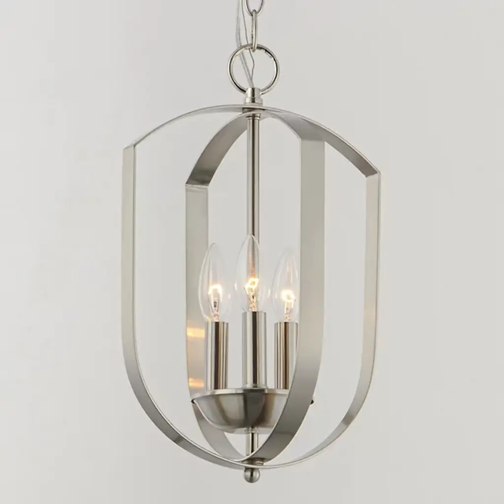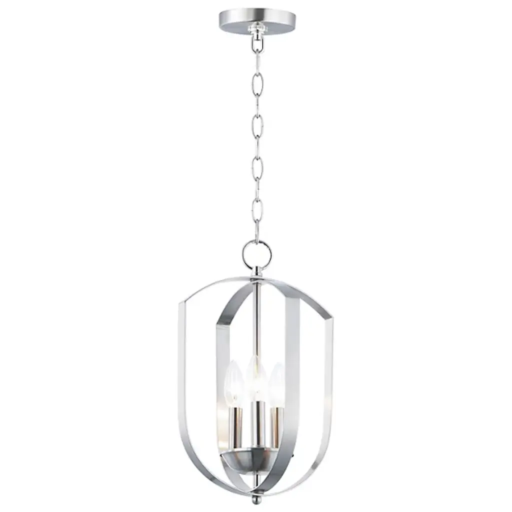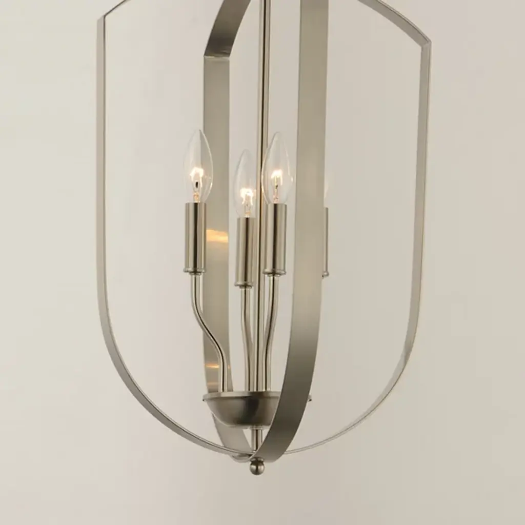 The Provident Pendant by Maxim Lighting is a handsome, airy design. Suspended from a round canopy by a linked chain, a decorative loop tops an openly styled frame made from slender metal bands that are gracefully curved, surrounding a set of exposed candelabras. A lovely finish dresses up the simple and sleek silhouette of this pendant as the lights within shine freely onto surroundings, offering spaces a bright, beautiful touch.