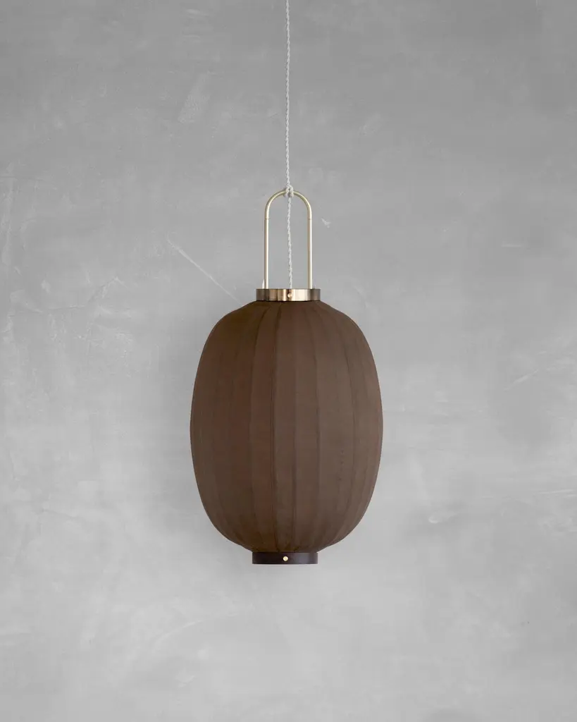 PU02B Pendant Lamp XL by Taiwan LanternDimensions: D 47 x W 47 x H 63 cm.Material: Walnut & bamboo frame, Hand-colored fabrics, Metal pipes, Leather lace, Handmade porcelain ceiling cap.This brown color is inspired by Wu Xing 五行. Brown presents Tu 土,earth, which signifies neutrality and good luck. The lantern is hand painted and finished with a layer of Tung oil which gives the lantern a smooth satin finish.Founded in 2013 by Pei-Ching Hsiao, Taiwan-Lantern is an Amsterdam-based studio on a mission to revive Taiwan's rich traditions and century-old craftsmanship. Beyond the common perception of mass production and electronics, our studio cherishes Taiwan's unique heritage, crafting items with stories and memories.We work with Taiwan’s last remaining traditional lantern factory and the finest local artisans. Together we embarked on an adventurous journey to modernize the design, optimize the quality, and return to natural materials.Each lantern involves various crafts, from ceramics, fabric dyeing with plants, painting, traditional knotting, woodworking, metal welding, and bamboo crafts. By combining these diverse traditional crafts, we honor our beloved heritage and advance the evolve the art of lantern making. Each lantern represents Taiwan's rich cultural legacy.We prioritize sustainability, using 95% locally sourced natural materials. Our lantern frames, crafted from walnut wood and locally grown Makino bamboo, connect Taiwan's historical roots with a sustainable future, infusing each lantern with heart and soul.