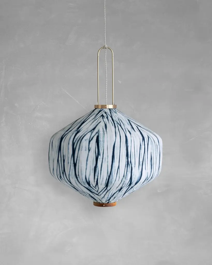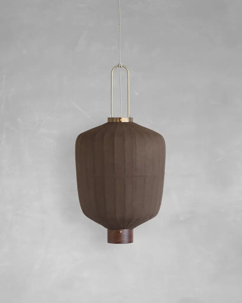 PU02M Pendant Lamp XL by Taiwan LanternDimensions: D 65 x W 65 x H 55 cm.Material: Walnut & bamboo frame, Hand-colored fabrics, Metal pipes, Leather lace, Handmade porcelain ceiling cap.This brown color is inspired by Wu Xing 五行. Brown presents Tu 土,earth, which signifies neutrality and good luck. The lantern is hand painted and finished with a layer of Tung oil which gives the lantern a smooth satin finish.Founded in 2013 by Pei-Ching Hsiao, Taiwan-Lantern is an Amsterdam-based studio on a mission to revive Taiwan's rich traditions and century-old craftsmanship. Beyond the common perception of mass production and electronics, our studio cherishes Taiwan's unique heritage, crafting items with stories and memories.We work with Taiwan’s last remaining traditional lantern factory and the finest local artisans. Together we embarked on an adventurous journey to modernize the design, optimize the quality, and return to natural materials.Each lantern involves various crafts, from ceramics, fabric dyeing with plants, painting, traditional knotting, woodworking, metal welding, and bamboo crafts. By combining these diverse traditional crafts, we honor our beloved heritage and advance the evolve the art of lantern making. Each lantern represents Taiwan's rich cultural legacy.We prioritize sustainability, using 95% locally sourced natural materials. Our lantern frames, crafted from walnut wood and locally grown Makino bamboo, connect Taiwan's historical roots with a sustainable future, infusing each lantern with heart and soul.