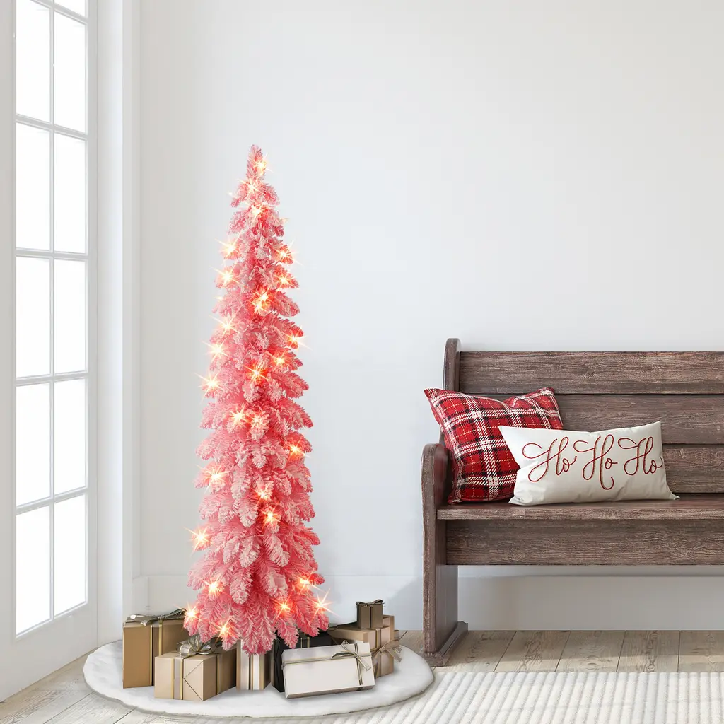 Embrace the joy of the holiday season into your home with the Puleo International Pre-Lit Artificial Christmas Tree. This 4-foot tall artificial holiday tree with fashion pink pine needles and an elegant shape perfectly captures the ambiance of the wintry forests in your home. Decorated with 70 pre-attached UL-listed clear incandescent lights, this pre-lit tree illuminates your home with a dazzling festive glow while eliminating the time-consuming hassle of hanging lights around your tree. This artificial tree has a full appearance with a total of 146 PVC branch tips and gorgeous life-like branches that stimulate a realistic feel of nature's beauty. Assembly is simple and quick and easy, and an attractive burlap base is included for convenient placement anywhere in your home. The flame-retardant, hypoallergenic, and needle-shed resistant tree offers a safer alternative to fresh-cut Christmas trees, so you can welcome in friends and family for holiday celebrations without worry. This product is backed by a five-year warranty on the tree and a two-year warranty on the lights for years of quality use. Features: 4' LIFELIKE CHRISTMAS TREE: 146 PE/PVC life-like pine needle branches create the natural look of a real Christmas tree for a timeless holiday accessory PRE-ATTACHED CLEAR LIGHTS: Decorated with 70 UL-listed incandescent lights that illuminate the home with a festive glow, eliminating the time and effort of hanging lights on your tree REALISTIC APPEARANCE: Features fashion pink pine needles and an elegant conical shape that perfectly capture the ambiance of the wintry forests in your home EASY SET UP AND DISPLAY: Assembly is simple and an attractive burlap base is included for convenient placement throughout the home SAFER FRESH-CUT TREE ALTERNATIVE: Flame-retardant, hypoallergenic, and needle-shed resistant so you can welcome in friends and family for the holidays without worry FAMILY OWNED COMPANY: Christmas is all about family, and so is Puleo International. As the Oldest Name for Christmas Trees in America, Puleo is a 4th generation family-owned manufacturer and distributor of high quality, hand-crafted artificial Christmas trees and home décor. With a long and rich history dedicated to producing beautifully designed artificial Christmas trees and home decor items, the Puleo family and its dedicated team of employees continues to deliver exceptional products of the highest quality and craftsmanship. This has enabled us to serve families like yours for more than 65 years and counting.