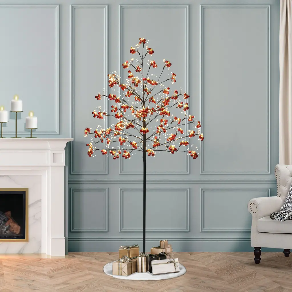 Embrace the joy of the holiday season into your home with the Puleo International Pre-Lit Warm White LED Artificial Flocked Twig Christmas Tree adorned with 360 small red ornaments. Enchanting and joyful, this 6-foot-tall artificial holiday tree with twig branches creates a mystifying, winter wonderland effect in or outside your home. Decorated with 1140 micro pre-attached warm white LED lights, this pre-lit Christmas tree illuminates your home with a bright and dynamic festive glow while eliminating the time-consuming hassle of hanging lights around your tree. This branch tree has realistic twig branches made from polyester and copper wire. Set this tree up in moments wherever you choose, with an included stand or the metal ground stake for indoor or outdoor display options. This product is backed by a one-year warranty on the tree.