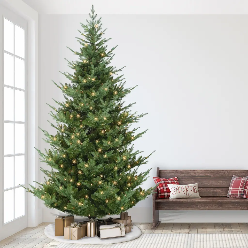 Embrace the joy of the holiday season into your home with the Puleo International Pre-Lit Hillside Spruce Artificial Christmas Tree. Enchanting and joyful, this 9-foot tall artificial holiday tree with verdant green pine needles and an elegant shape perfectly captures the ambiance of the wintry forests in your home. Decorated with 600 pre-attached UL-listed clear incandescent lights, this pre-lit Christmas tree illuminates your home with a dazzling festive glow while eliminating the time-consuming hassle of hanging lights around your tree. It has a full appearance with a total of 2824 PVC branch tips and gorgeous life-like branches that stimulate a realistic feel of nature's beauty. Assembly is quick and easy with 4 hinged tree sections, and an attractive metal stand is included for convenient placement anywhere in your home. The flame-retardant, hypoallergenic, and needle-shed resistant tree offers a safer alternative to fresh-cut Christmas trees, so you can welcome in friends and family for holiday celebrations without worry. This product is backed by a five-year warranty on the tree and a two-year warranty on the lights for years of quality use. Features: