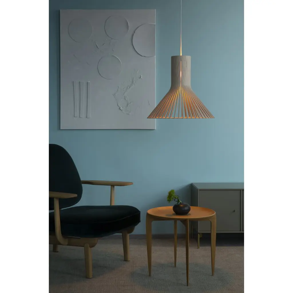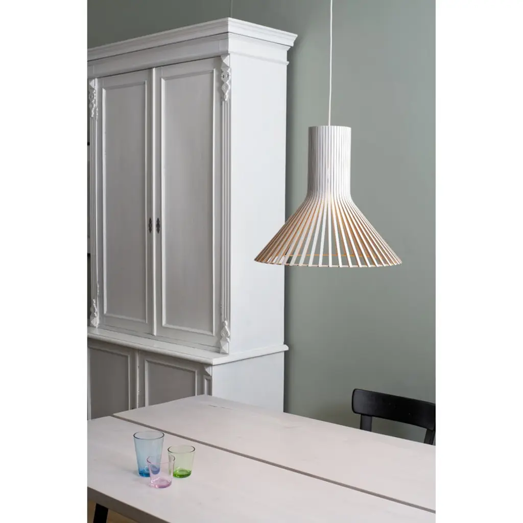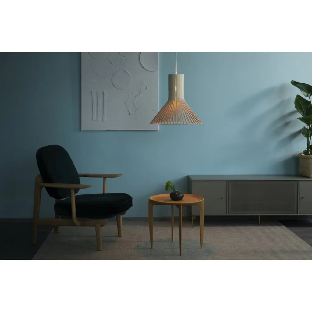 Puncto 4203 pendant lamp by Secto Design is designed especially for low spaces and is particularly well suited above a dining table, for instance. Thanks to the wide lower end of the shade, the lamp gives off a broad light beam. Secto Design luminaires are handmade in Finland from form-pressed Finnish birch. The lamps have clean Scandinavian silhouettes, and the wooden surface gives them a warm and appealing character. Secto lamps are designed by architect Seppo Koho who wanted to develop a softly filtering light that doesn’t dazzle but invites people to come closer. Secto lamps emphasize space and environment by creating a unique atmosphere and feeling of closeness.