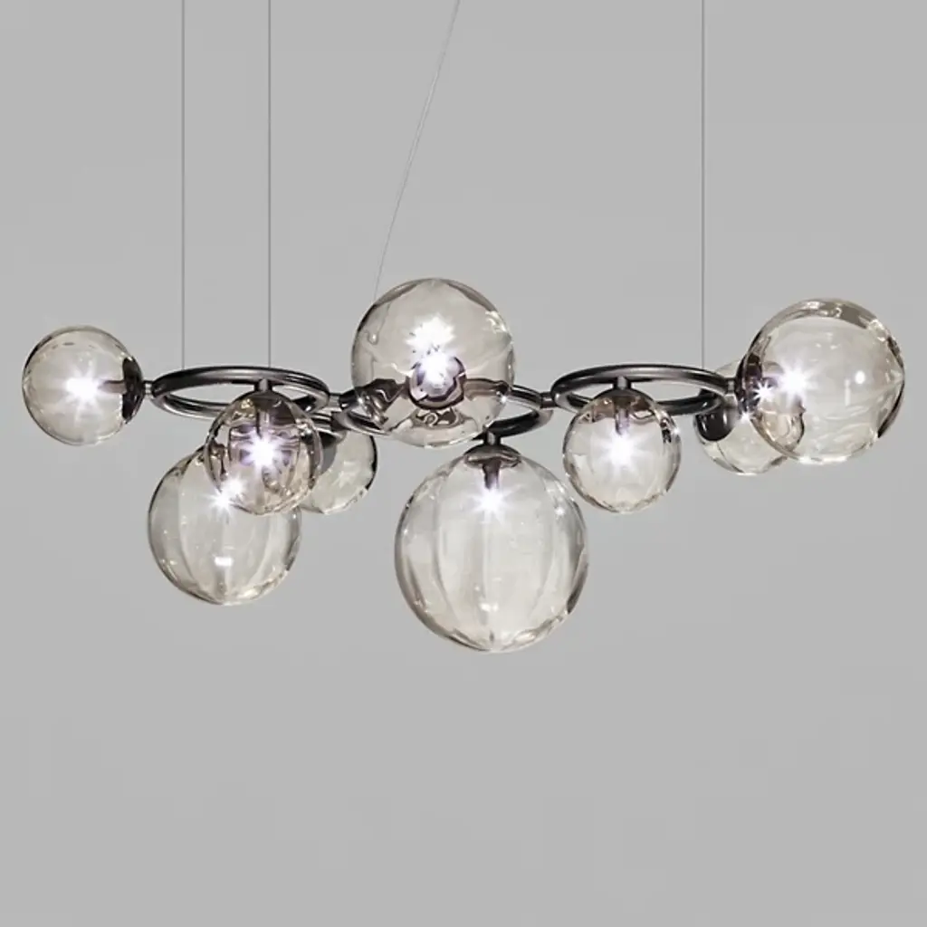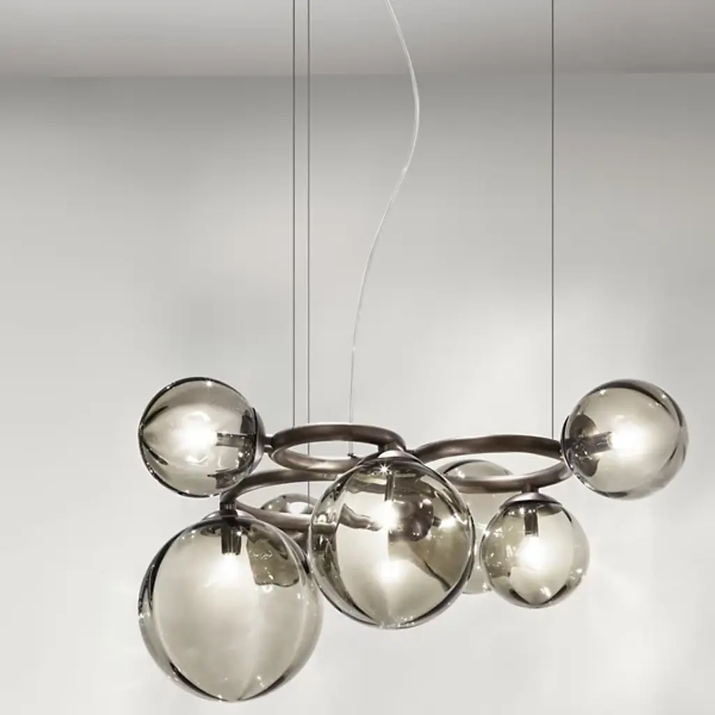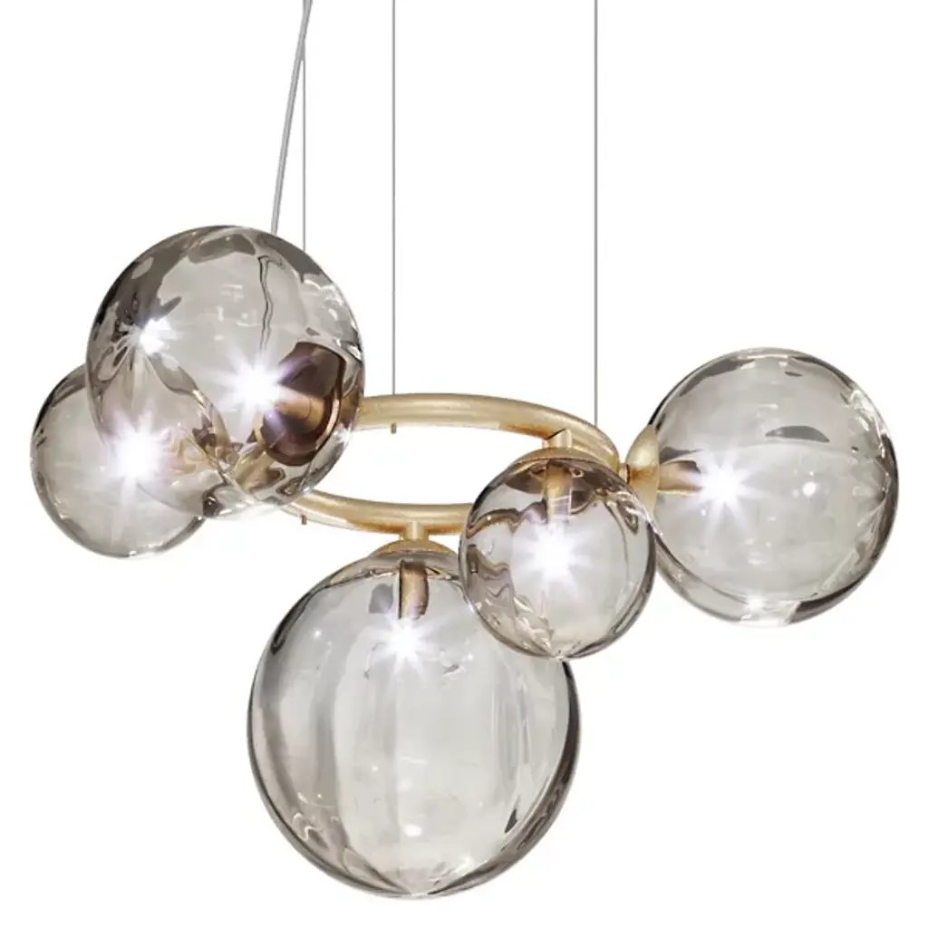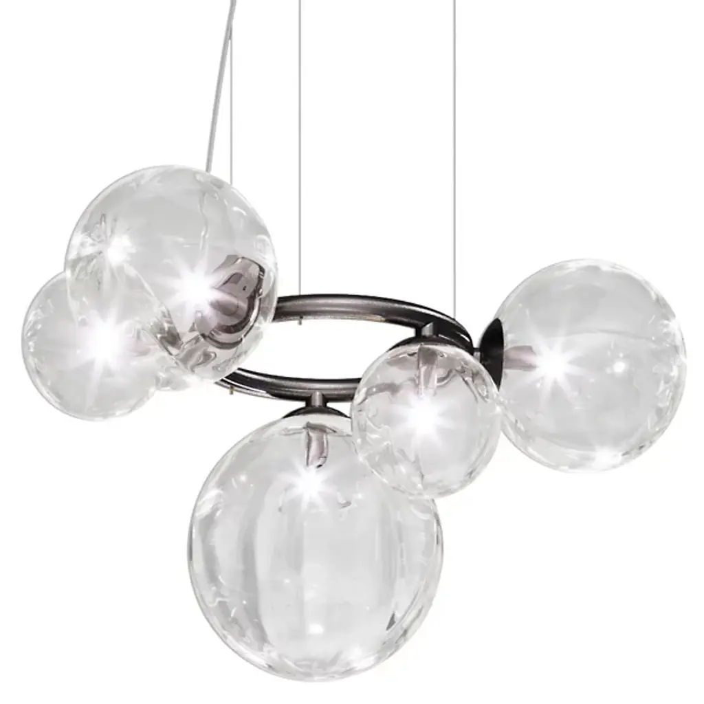 The Puppet Ring Pendant from Vistosi keeps the eye moving with a dynamic composition of handcrafted shapes like the sight of a mesmerizing puppet show. This pendant’s curved shapes are a reference to designs of the 60s. The minimalist quality of the shapes underscores designer Romani Saccani Architetti Associati’s idea that simplicity is at the core of elegance. Like a puppet master's strings, the pendant’s suspension appears near invisible to put focus on the subject. A metal ring frame serves as the anchor point for the sculptural arrangement of glass. Each handblown glass globe invites a detailed look as they carry a flowy surface texture. The multi-directional globes pair with the brilliant bulbs to create a warm aura and a memorable silhouette.