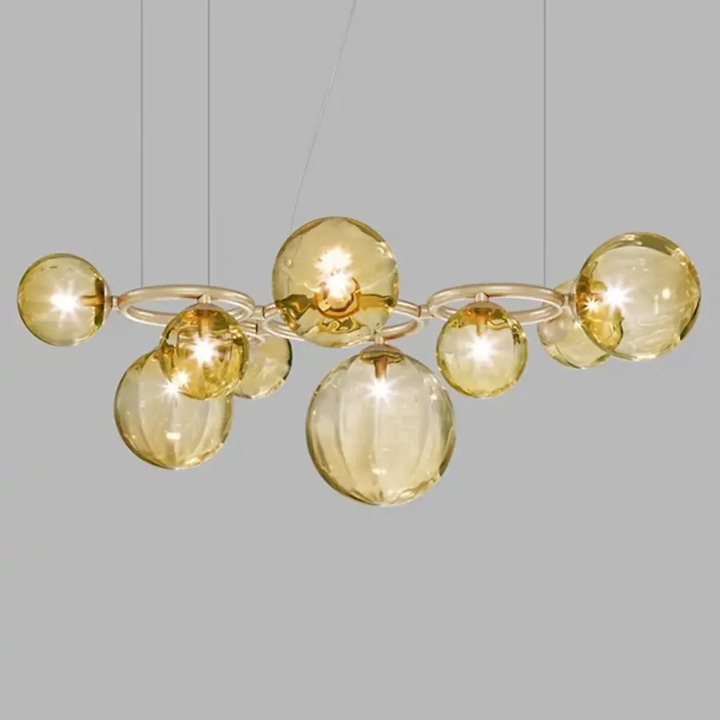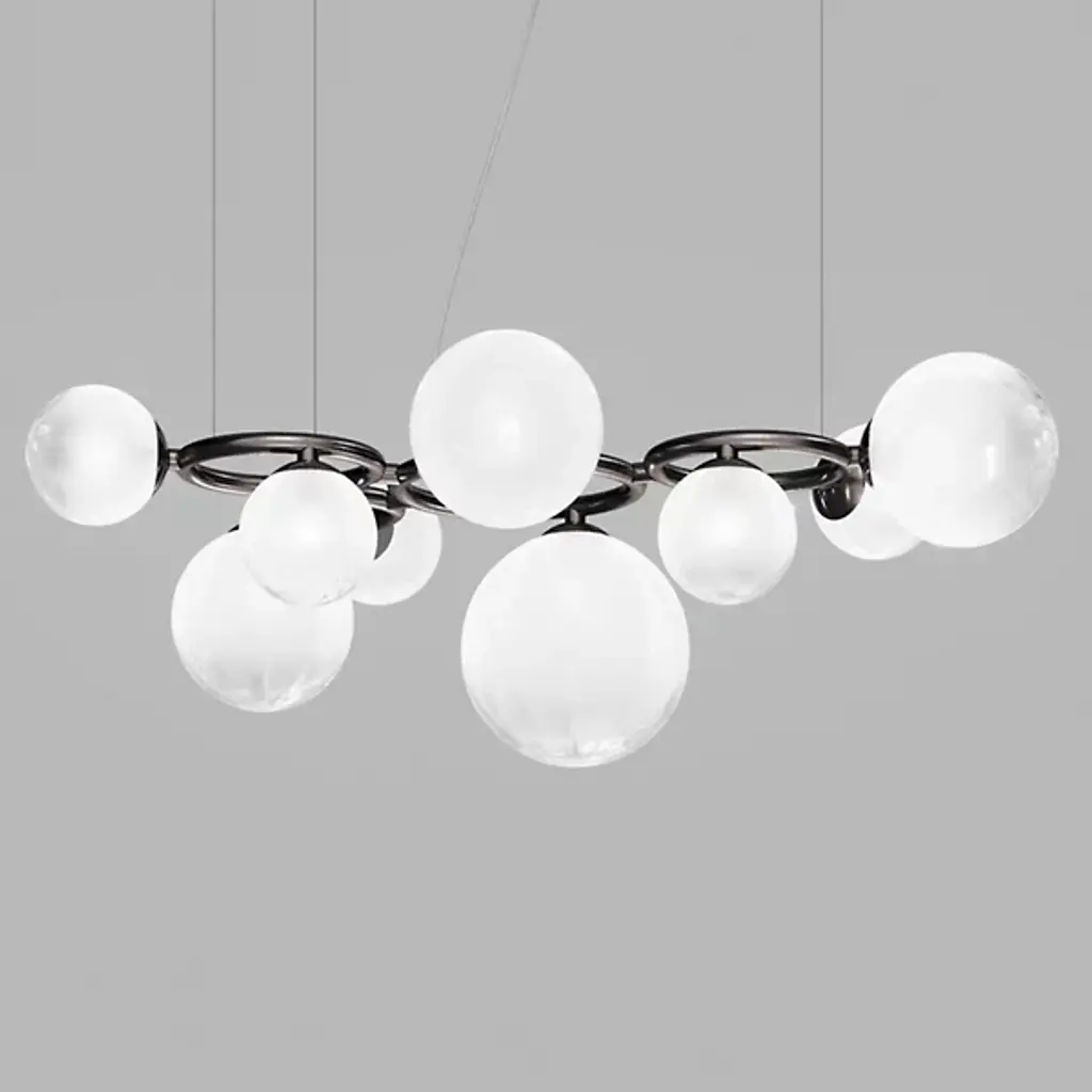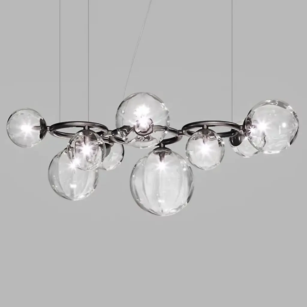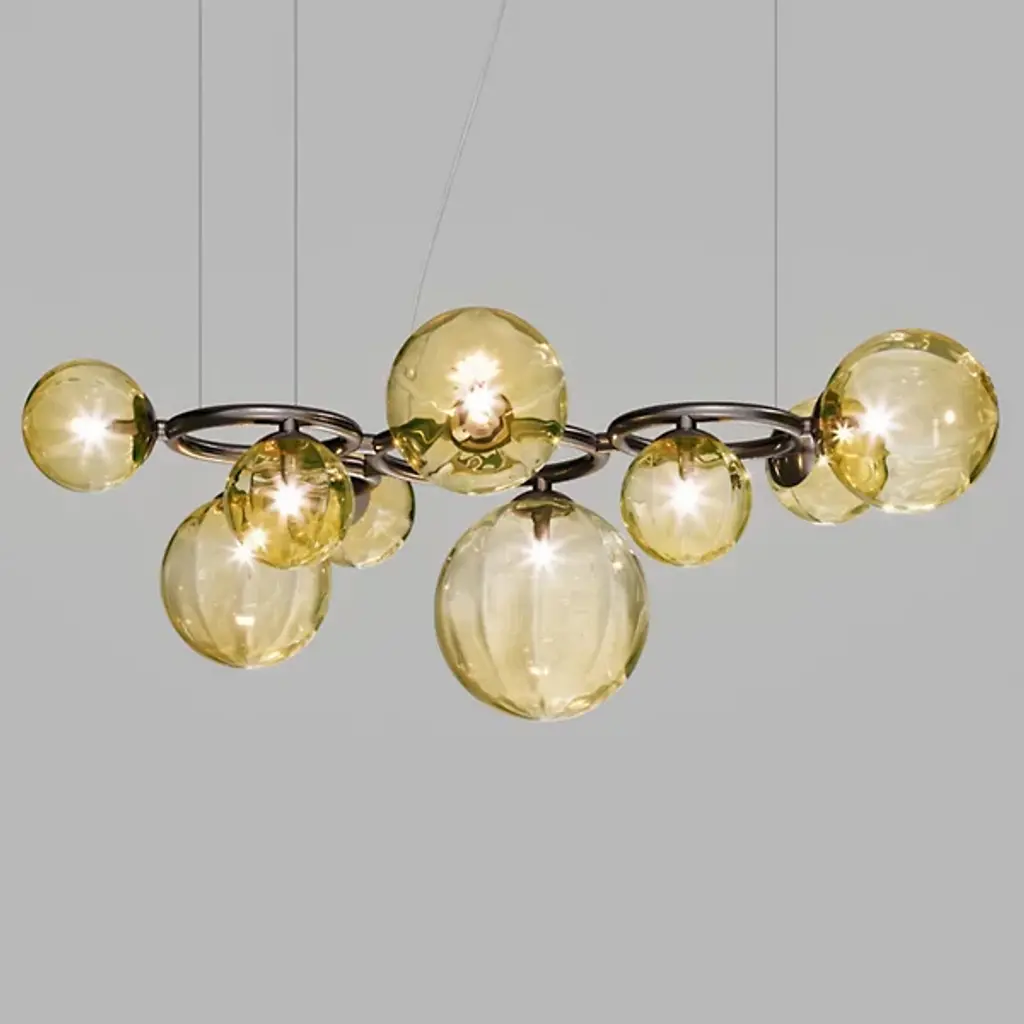 The Puppet Ring Pendant from Vistosi keeps the eye moving with a dynamic composition of handcrafted shapes like the sight of a mesmerizing puppet show. This pendant’s curved shapes are a reference to designs of the 60s. The minimalist quality of the shapes underscores designer Romani Saccani Architetti Associati’s idea that simplicity is at the core of elegance. Like a puppet master's strings, the pendant’s suspension appears near invisible to put focus on the subject. A metal ring frame serves as the anchor point for the sculptural arrangement of glass. Each handblown glass globe invites a detailed look as they carry a flowy surface texture. The multi-directional globes pair with the brilliant bulbs to create a warm aura and a memorable silhouette.