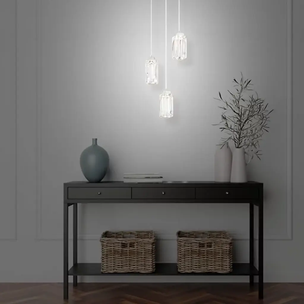 Bright, elegant, revealing. The Putnam Place LED Multi-Light Pendant from George Kovacs pleases the studious eye through the reflective details and sculptural form of its glass vessels. The pendant’s clean composition speaks to the modern and contemporary space. It streams down with a fine cord suspension. Cube-shaped lamp holders accent the piece with a sleek metal edge. Clear glass shades in rectangular forms get the eye to travel through its elegant oval openings. LEDs are concealed above to showcase every fine detail of the glass. The LED light produces stunning reflections on the glass as an ambient light source.