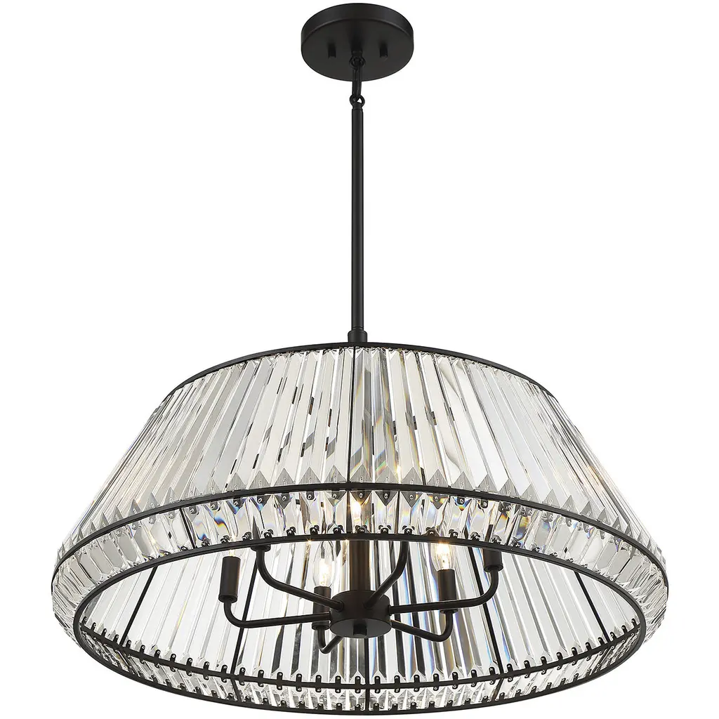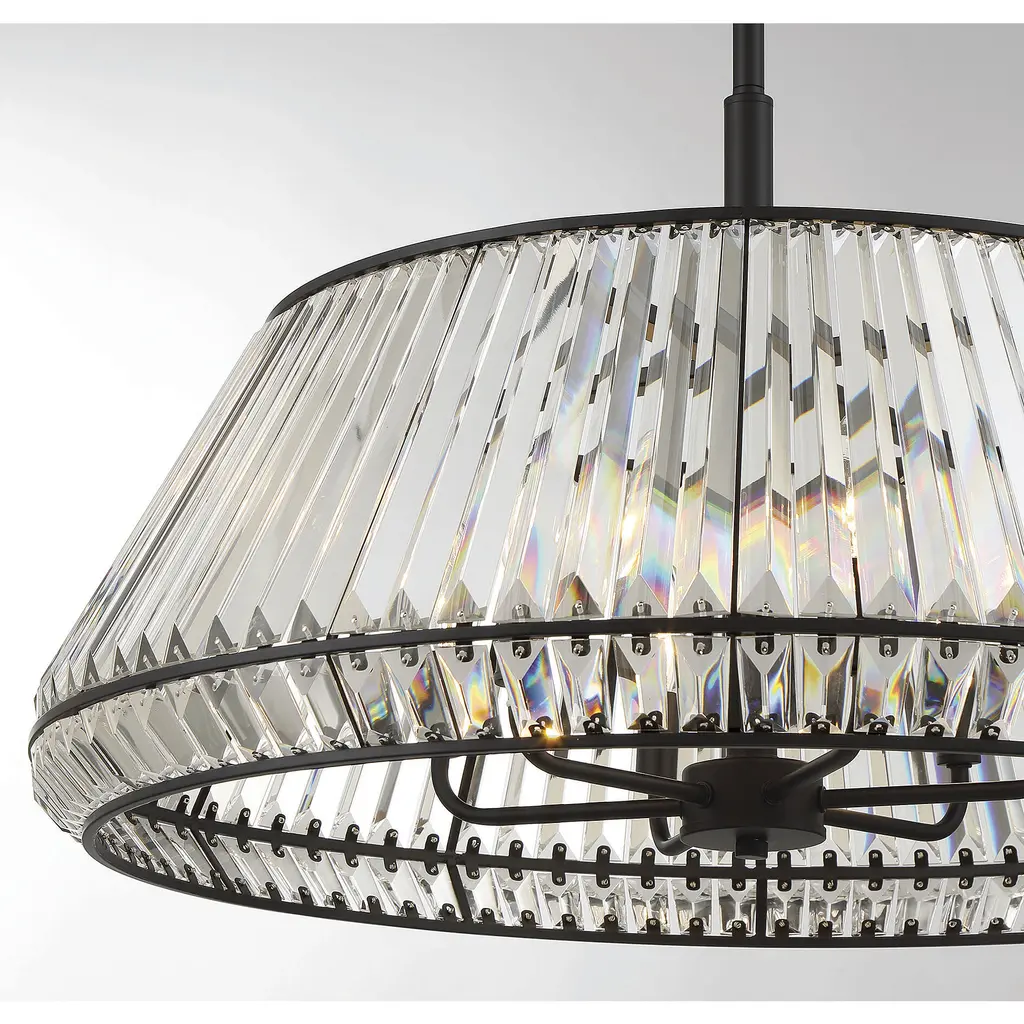 Adorn your home with the stunning crystal beauty of the Savoy House Pyramid 6-light pendant. Its geometric shade is decorated with long, slim, faceted clear crystals for a look that recalls a pleated lamp shade, but with so much more glamour. Finished in matte black. Pyramid is 29" in width and has an adjustable height ranging from 22" to 68". It uses six candelabra size bulbs of up to 60 watts per bulb. Comes with four 12" downrods and one 6" downrod, plus 80" of cord.