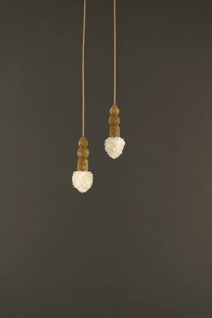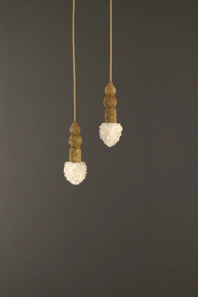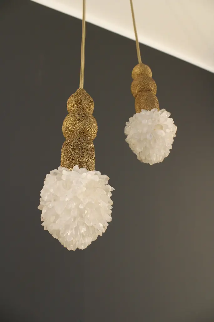Quartz Pendant Lamp by AverDimensions: D 8 x W 8 x H 26 cm Materials: Natural white quartz, metal, ceramic.Available in Gold Plated, Silver Plated, Aged Gold Plated, Aged Silver Plated, Aged Gold Patina, Antique Patina, Matte Black, Vintage Gold, Rustic Silver, or Rustic Bronze. All our lamps can be wired according to each country. If sold to the USA it will be wired for the USA for instance.Designed to be more than a LED light source, it blends the everyday with handcrafted artistry, featuring inherent quartz that creates a unique ambiance.The history of Aver Metais as a lighting brand begins with Jefferson Aver manufacturing lamps in a completely handcrafted way and with very few resources in the family business. Over the years, the brand has grown and gained recognition. Today, our products are present in several projects by prestigious professionals, in addition to being resold in lighting boutiques in different regions of Brazil. Through its partners, Aver Metais has several participations in important design and architecture exhibitions. In 2015 the company started its internationalization process and today has clients and projects carried out in places like New York, Los Angeles, Chicago, Dallas, Miami, London, Cardiff, Hamburg, Manila, Santa Cruz de la Sierra, and Lima, attesting to the level quality and competitiveness of Aver Metais products.In our factory, each piece is meticulously produced using modern production processes combined with craftsmanship to detail. The result is original pieces that, more than illuminate, are jewels for your home. Over the years, the brand has been dedicated to creating and producing original and high-quality decorative lighting fixtures that can fit into the most varied and demanding interior architecture projects.