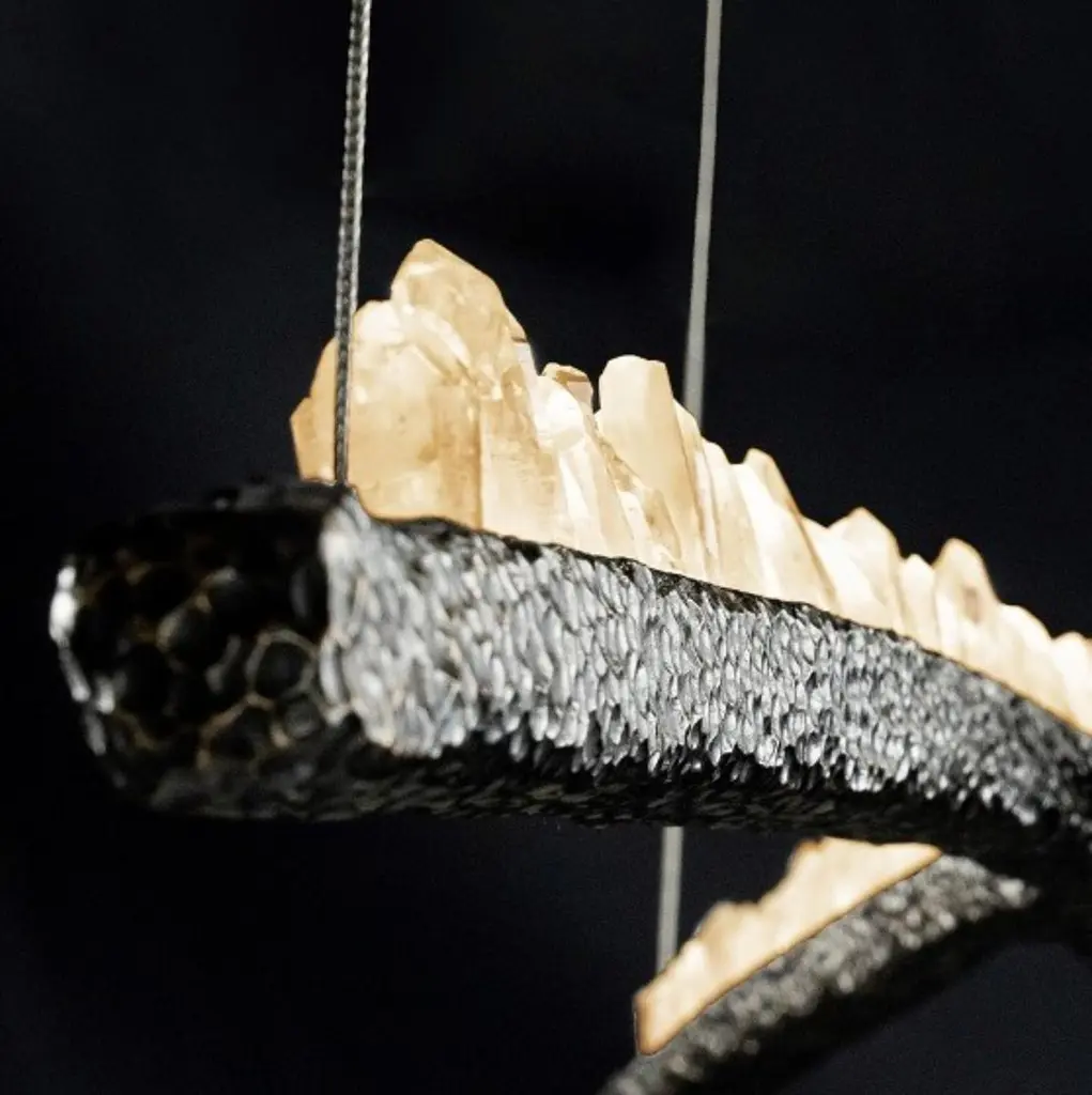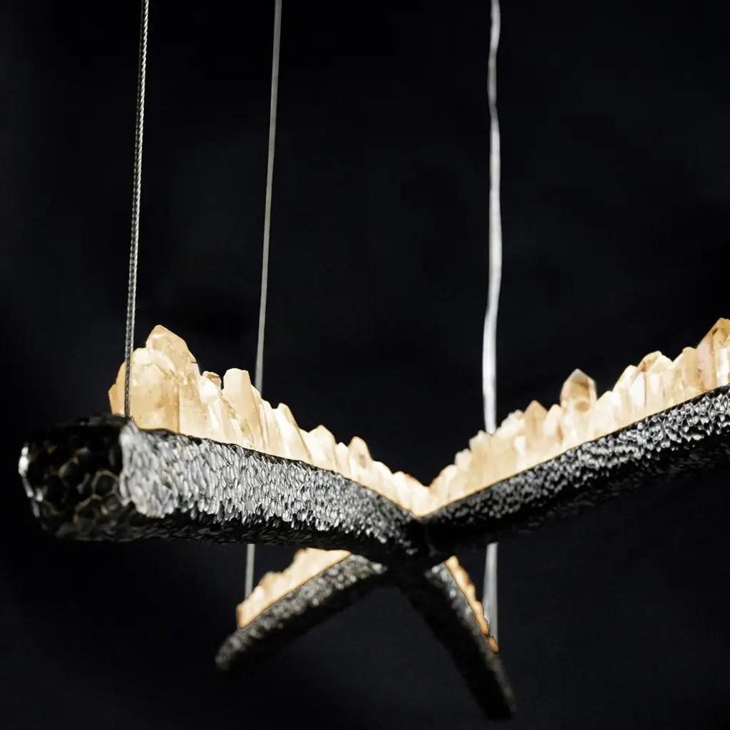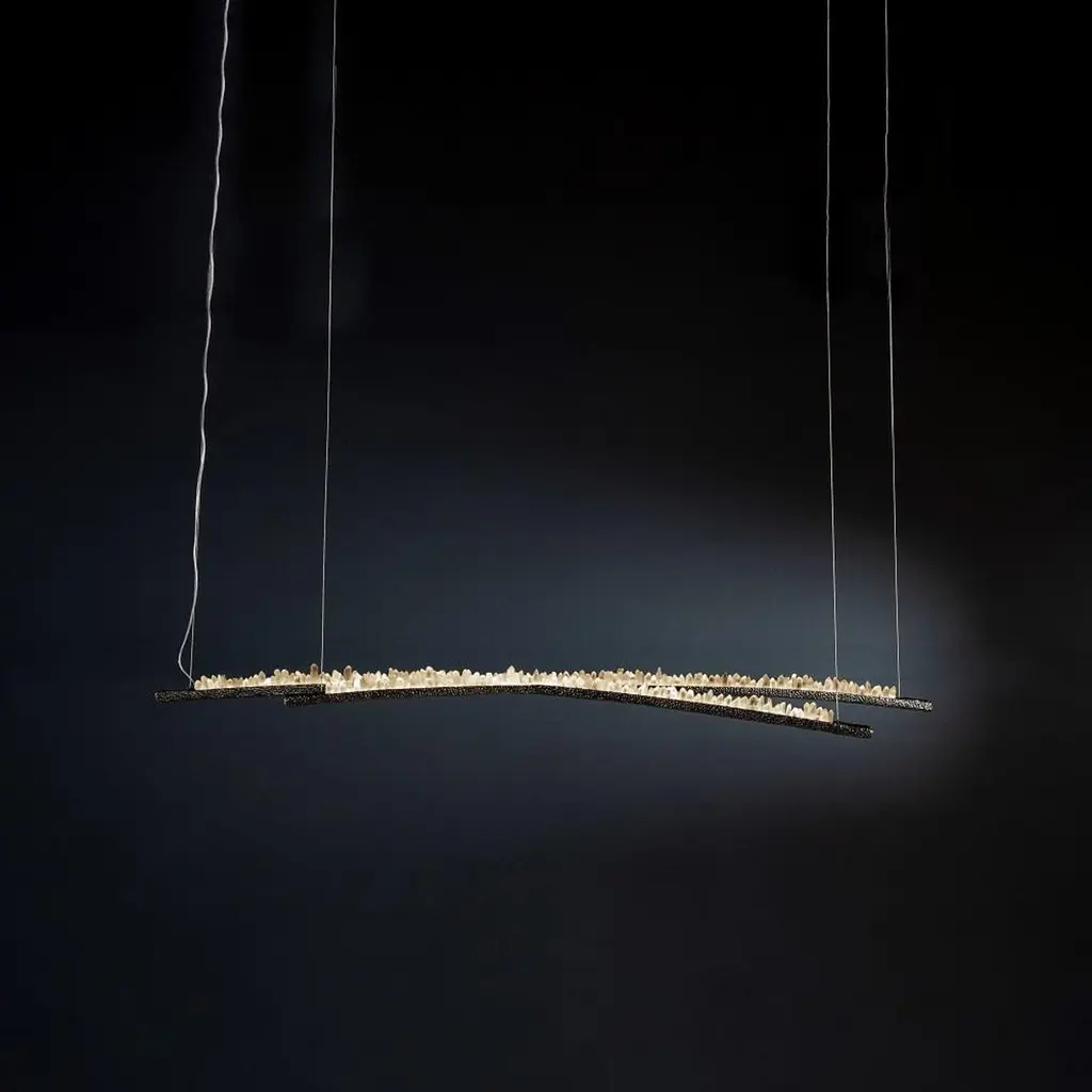 Quartz pendant light I by AVerDimensions: W 180 x D 40 x H 12 cmMaterials: Natural rocks, high-quality cut crystals, jewelry chains, hand-blown glass, other.Also available: matte black, rustic silver, oxidized graphite, and rustic bronze.A series of linear and minimalist lamps created to be used preferably in sets, creating a shoal effect. It has a fine line of translucent quartz tips covered by a delicate ceramic sculpted elegantly by our artisans by hand.All our lamps can be wired according to each country. If sold to the USA it will be wired for the USA for instance.
