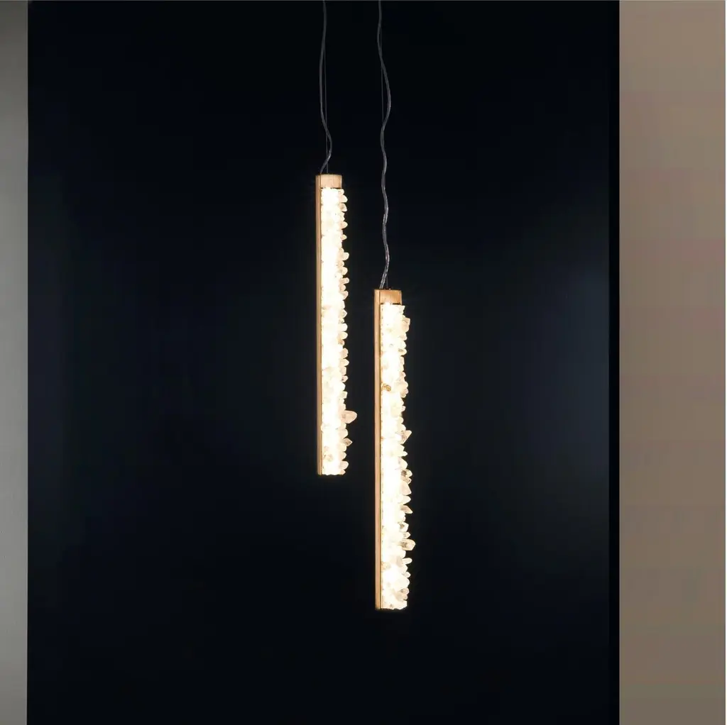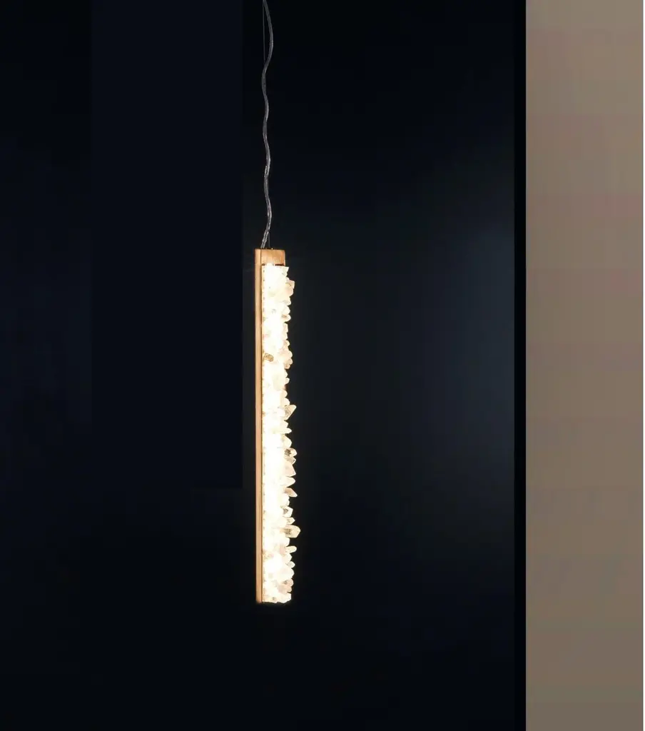 Quartz vertical pendant lamp by Aver Signed by Waldir JuniorDimensions: D 10 x W 5 x H 62 cm Materials: Aluminum, antique Bronze finish. Natural White Quartz and Smoky Quartz.Lighting: 01 x 10W LED 800 lumens.Finish: Silver Veneer, Aged Silver Veneer, Gold Veneer, Aged Gold Veneer, Copper Veneer, Aged Copper Veneer, Aged Gold Patina, Antique Patina.All our lamps can be wired according to each country. If sold to the USA it will be wired for the USA for instance.A new collection of lamps was signed by Waldir Junior for Aver Metais. The Carbonite line is characterized by its geometric design with striking lighting through natural quartz druses. Price with canopy for plaster lining. Source not included, purchase separately.The history of Aver Metais as a lighting brand begins with Jefferson Aver manufacturing lamps in a completely handcrafted way and with very few resources in the family business. Over the years, the brand has grown and gained recognition. Today, our products are present in several projects by prestigious professionals, in addition to being resold in lighting boutiques in different regions of Brazil. Through its partners, Aver Metais has several participations in important design and architecture exhibitions. In 2015 the company started its internationalization process and today has clients and projects carried out in places like New York, Los Angeles, Chicago, Dallas, Miami, London, Cardiff, Hamburg, Manila, Santa Cruz de la Sierra, and Lima, attesting to the level quality and competitiveness of Aver Metais products.In our factory, each piece is meticulously produced using modern production processes combined with craftsmanship to detail. The result is original pieces that, more than illuminate, are jewels for your home. Over the years, the brand has been dedicated to creating and producing original and high-quality decorative lighting fixtures that can fit into the most varied and demanding interior architecture projects.