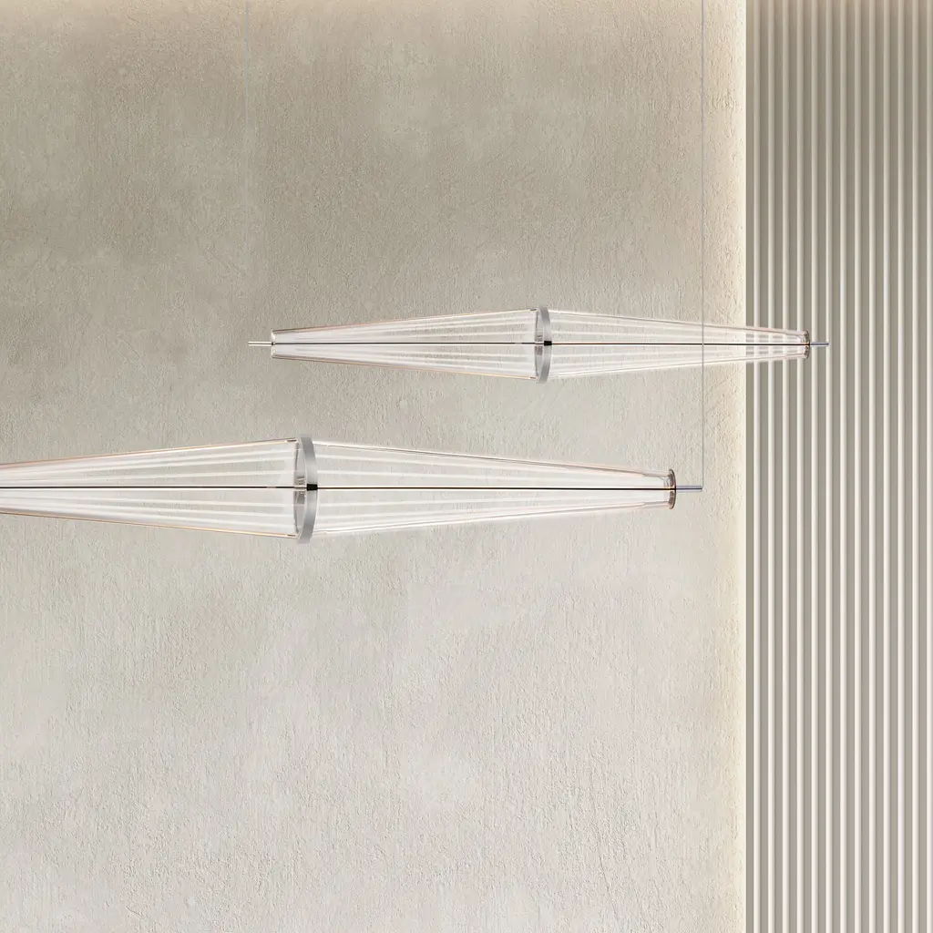 A arrangement of stainless steel and light guided acrylic form elongated rhombus shapes discreetly lit by LED. On the larger size pendants an additional aircraft cable kit is provided so that you can mount the pendants either vertically or horizontally at various angles. Finished in Polished Chrome, these pendants are out of this world.
