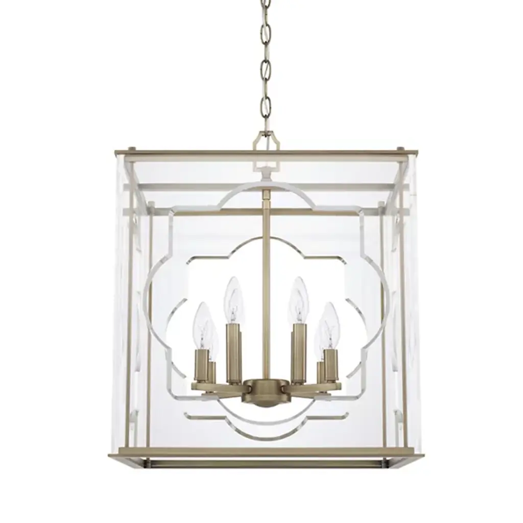 A modern design surrounded by an aura of elegance. The Quatrefoil Glass 8-Light Pendant from Capital Lighting presents you with a gorgeous frame for its inspiring light. It’s a true centerpiece, hanging in the air with a fine chain-link suspension. An intricate square metal framework sharpens up the silhouette against the crisp acrylic enclosure. This acrylic is used to bring focus to the lighting elements, framing them with an ornamental pattern cutout. Candelabra bulbs top neat lamp holders for a classically inspired silhouette. These pointed bulbs produce a shine seen reflected as brilliant highlights on the acrylic’s edges. Brilliant light filters through the box as a spacious glow.