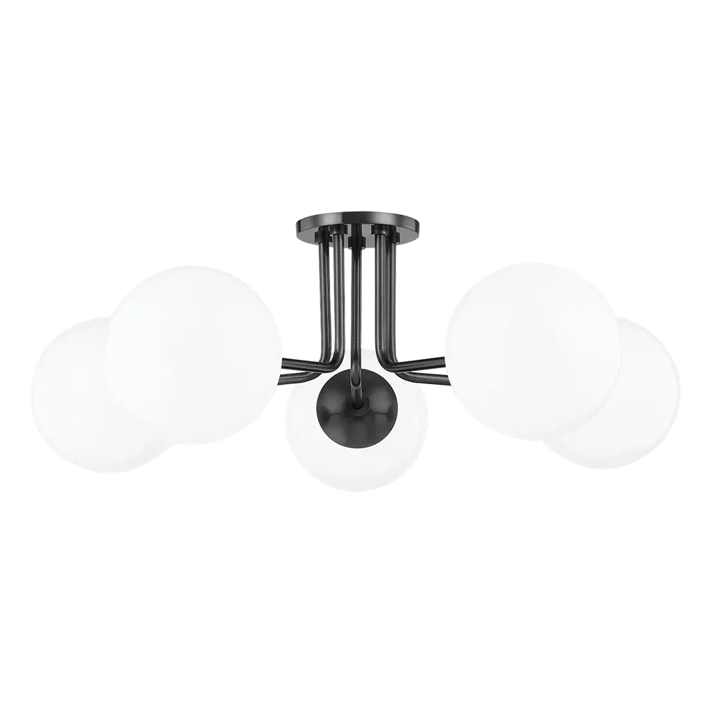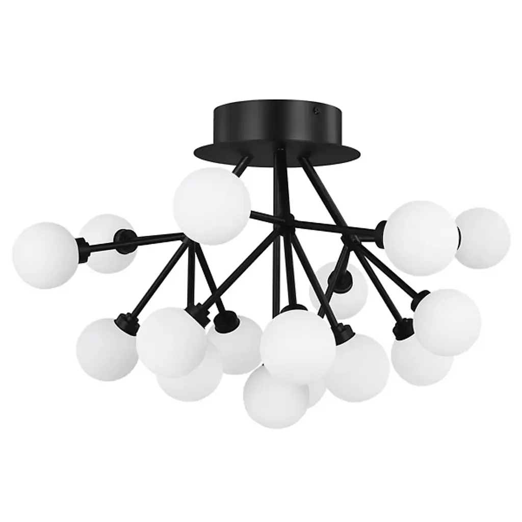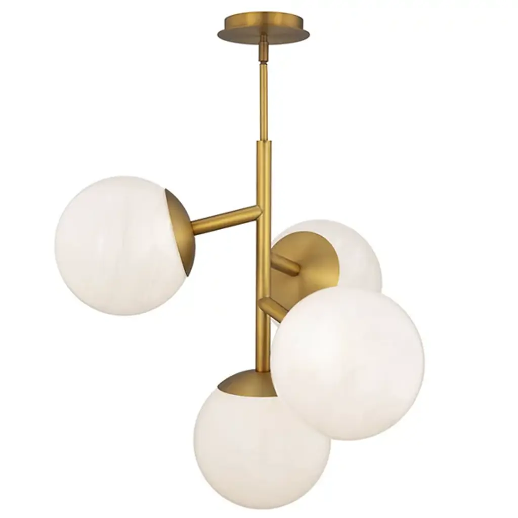 The Quattro LED Pendant from dweLED features four frosted glass spheres arranged offset from each other around a central stem. Each orb is positioned at varying intervals along the vertical axis, creating a sculptural composition that appears to orbit the core structure. The aluminum framework supports the translucent globes, which diffuse light throughout the surrounding area. This multi-globe design offers visual interest through its asymmetrical arrangement, with each sphere contributing to the overall geometric study in three-dimensional space.