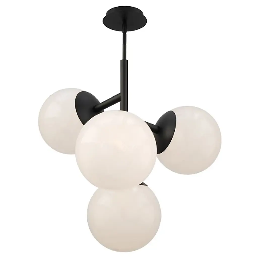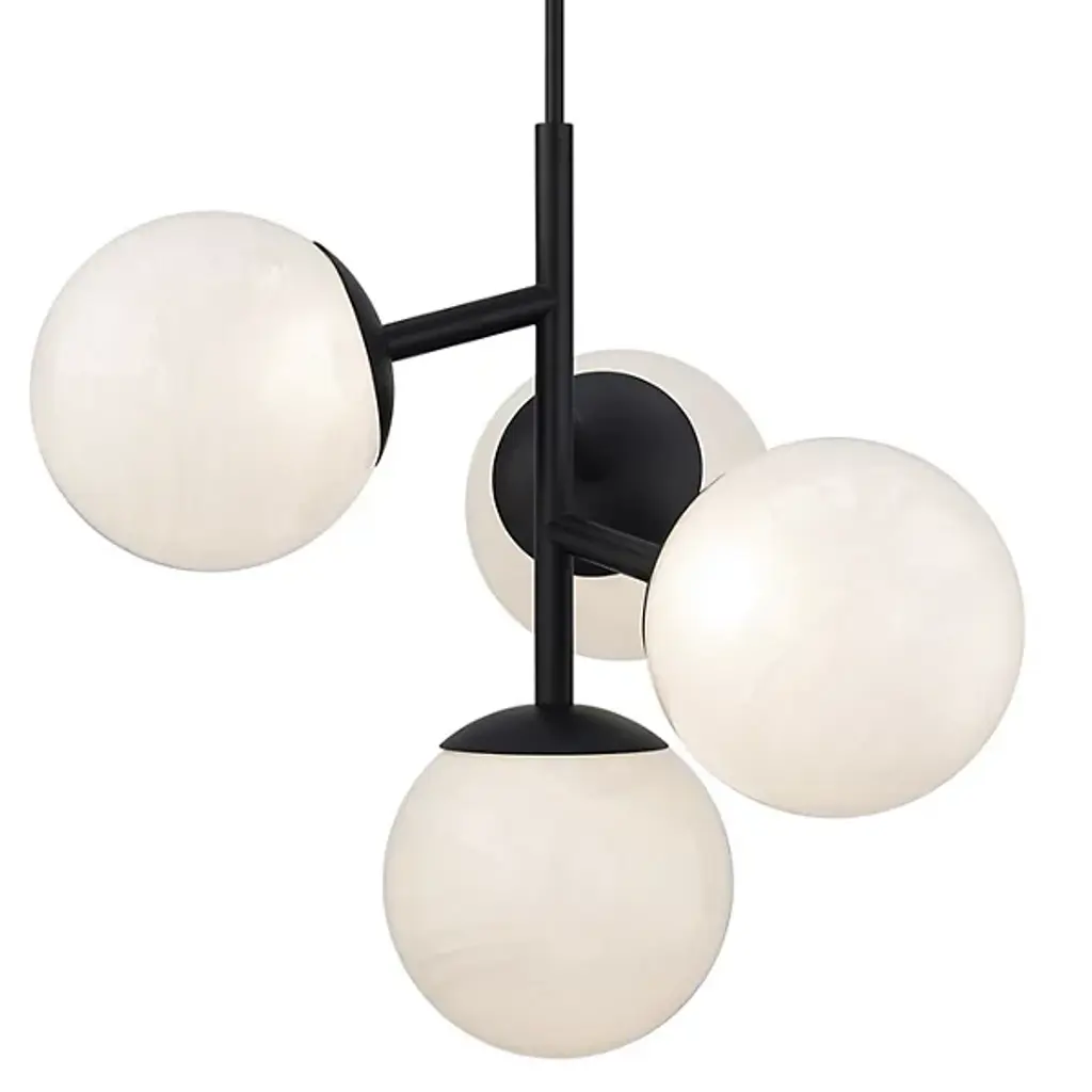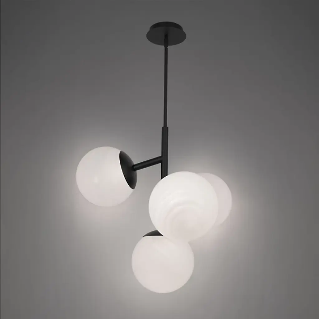 The Quattro LED Pendant from dweLED features four frosted glass spheres arranged offset from each other around a central stem. Each orb is positioned at varying intervals along the vertical axis, creating a sculptural composition that appears to orbit the core structure. The aluminum framework supports the translucent globes, which diffuse light throughout the surrounding area. This multi-globe design offers visual interest through its asymmetrical arrangement, with each sphere contributing to the overall geometric study in three-dimensional space.