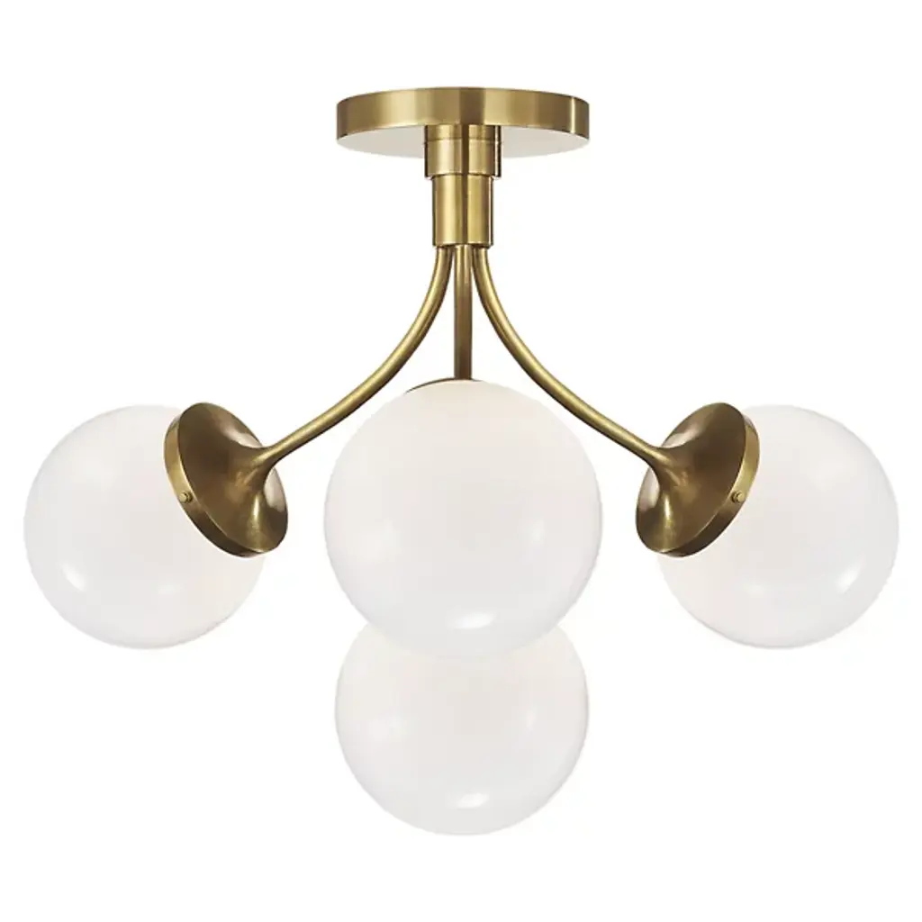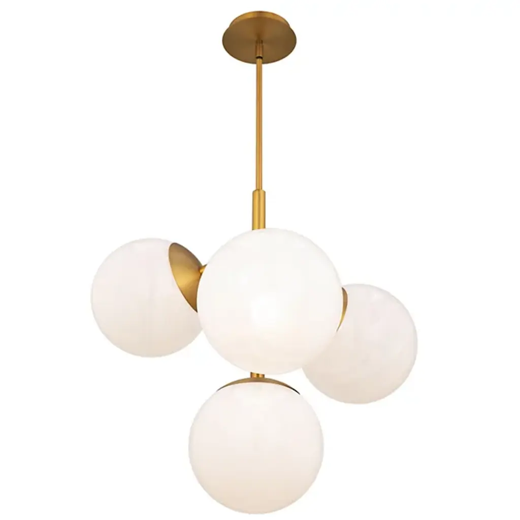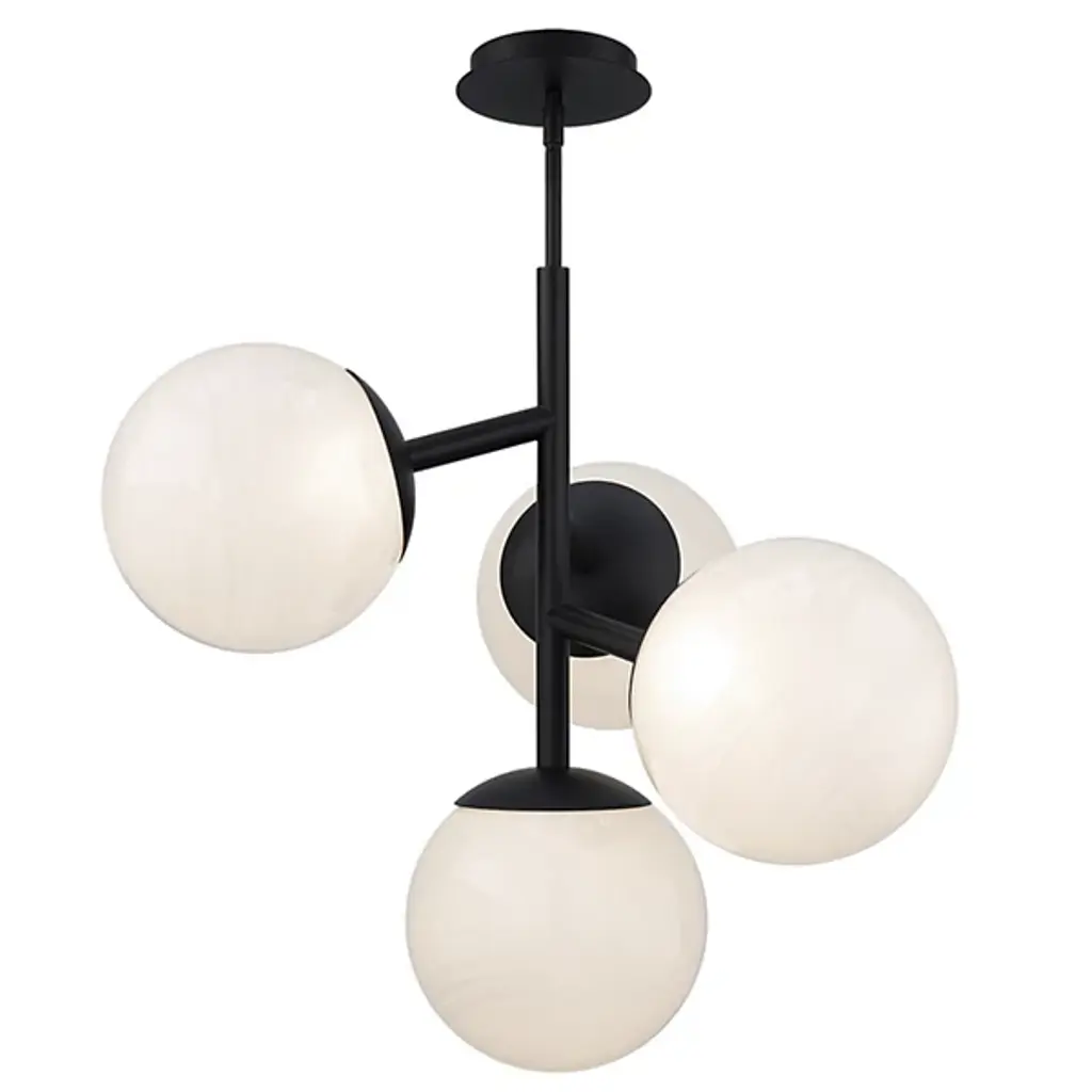 The Quattro LED Pendant from dweLED features four frosted glass spheres arranged offset from each other around a central stem. Each orb is positioned at varying intervals along the vertical axis, creating a sculptural composition that appears to orbit the core structure. The aluminum framework supports the translucent globes, which diffuse light throughout the surrounding area. This multi-globe design offers visual interest through its asymmetrical arrangement, with each sphere contributing to the overall geometric study in three-dimensional space.