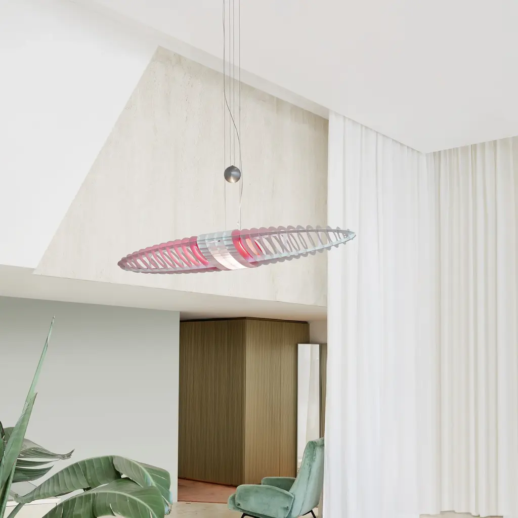 Doubled in size and visual impact, designed to light up large spaces. A pair of interchangeable filters make it possible to color the aluminum body without interfering with the white light emission. Features