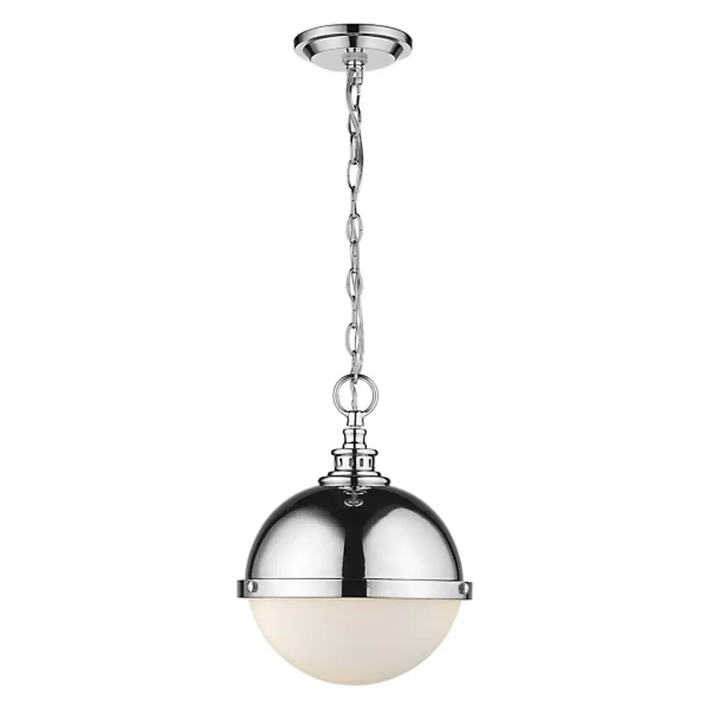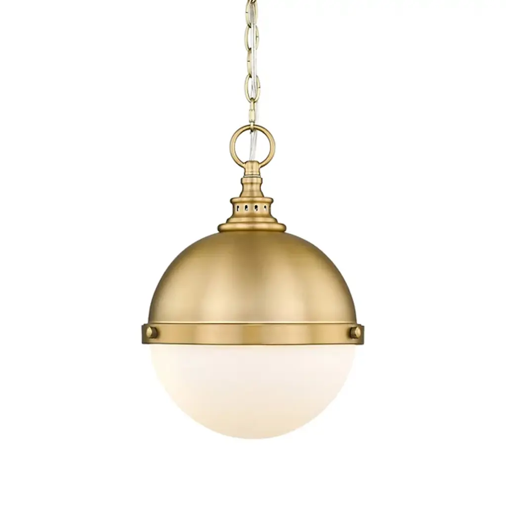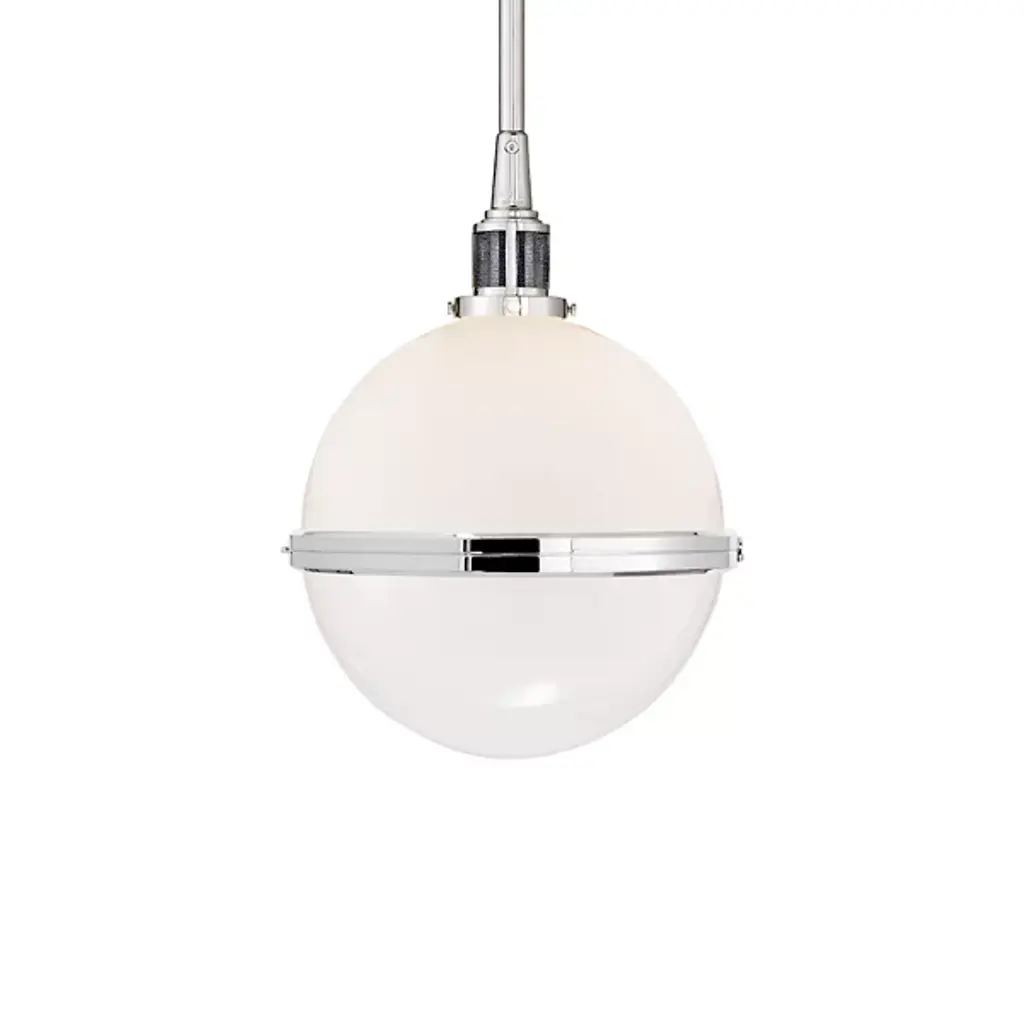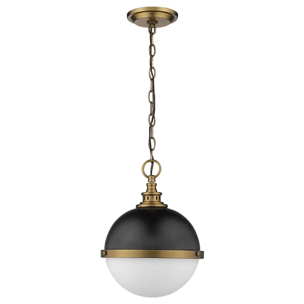 Bright, bold, impactful. The Quentin Pendant from Alder & Ore is an unmissable sphere, defined by the intricacies of its industrial accents. The pairing of fine accents and simple shapes lends the piece to various home styles. The pendant streams down with a time-tested chain-link suspension. A tiered finial atop the globe reminds one of the vented features of industrial lighting. The globe looks dramatic in its 2-tone hemispheres. The bottom opaque diffuser receives a golden hue as it filters out an ambient downlight.