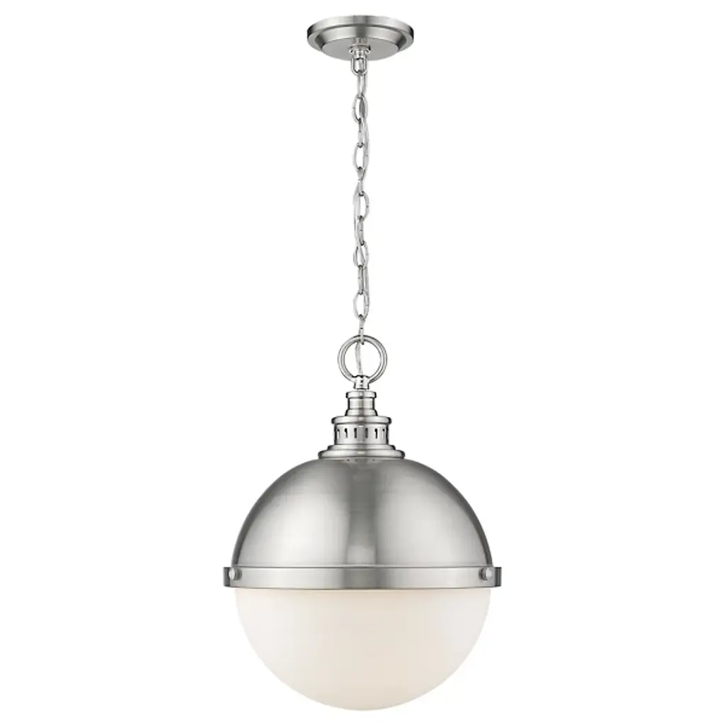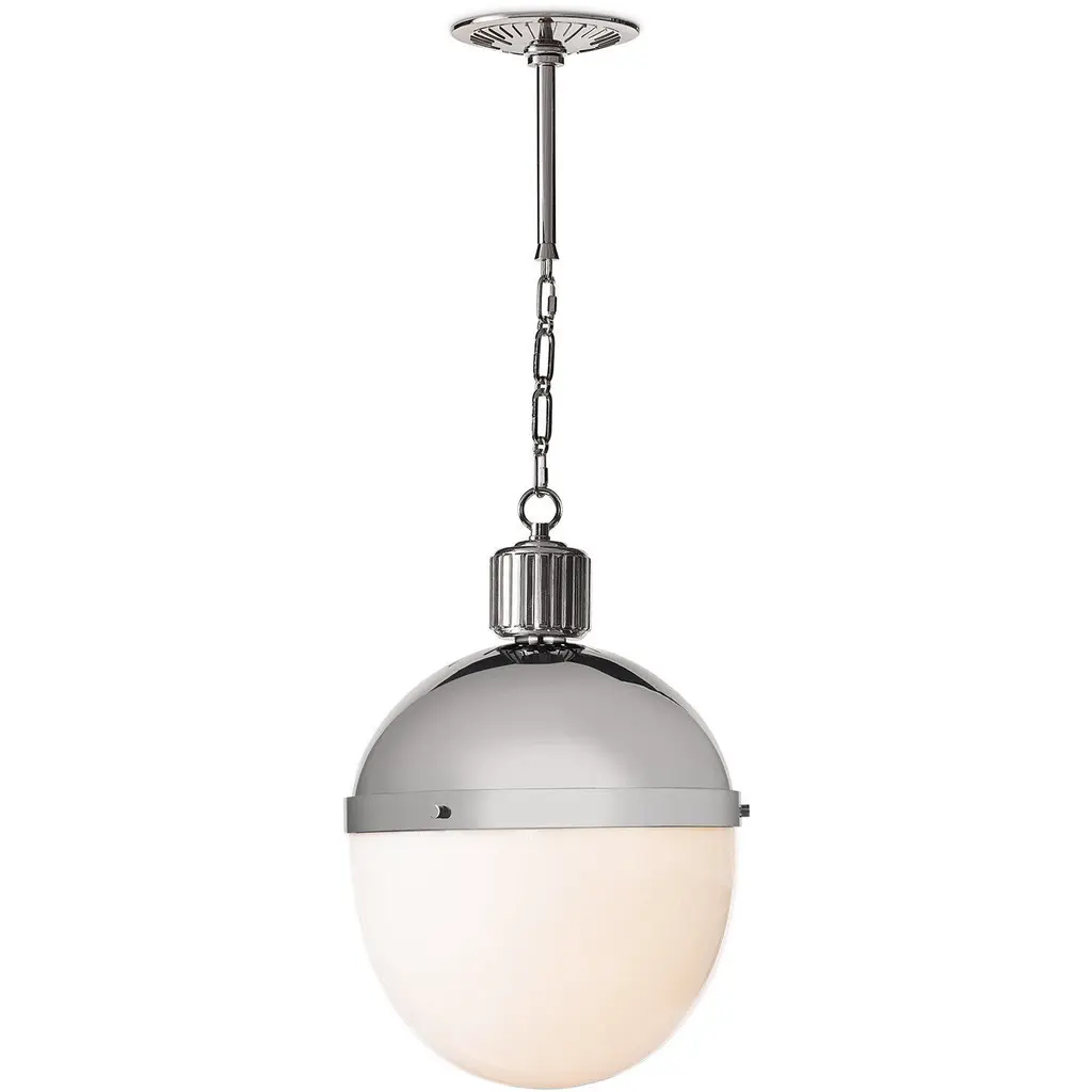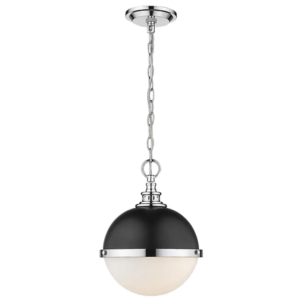 Bright, bold, impactful. The Quentin Pendant from Alder & Ore is an unmissable sphere, defined by the intricacies of its industrial accents. The pairing of fine accents and simple shapes lends the piece to various home styles. The pendant streams down with a time-tested chain-link suspension. A tiered finial atop the globe reminds one of the vented features of industrial lighting. The globe looks dramatic in its 2-tone hemispheres. The bottom opaque diffuser receives a golden hue as it filters out an ambient downlight.