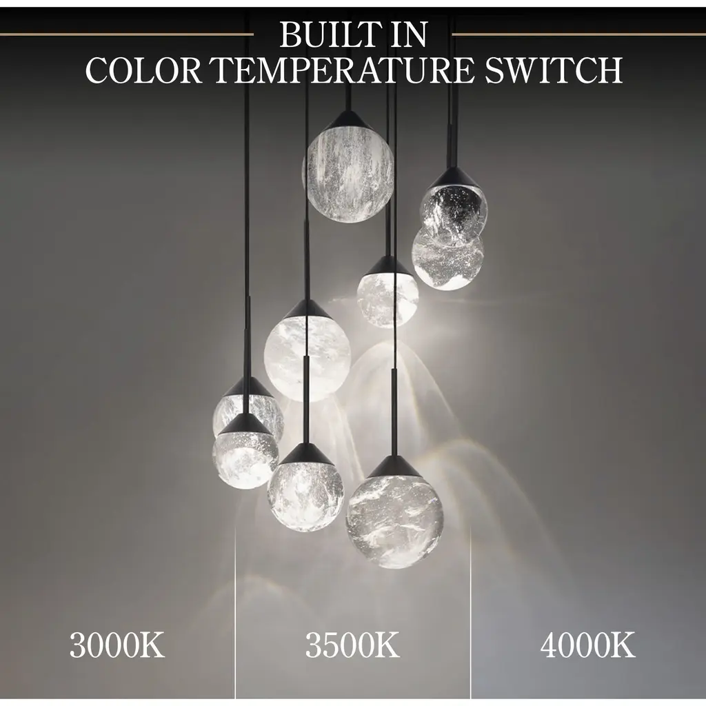 Crystal ball patterned to offer enhanced illumination, this Schonbek Optic haze crystal sphere projects omnidirectional high quality LED illumination for an astonishing, graceful aesthetic. Schonbek Beyond LED luminaires feature a 3-CCT color temperature selectable switch that can be accessed at the time of installation to toggle between 3000K-3500K-4000K color temperatures. Ultra-sleek electrified cables eliminate the need for clunky power wires and the height is simple to adjust through push pin connectors on the canopy up to 10ft of length. Quest is offered in multi-light (3 Light, 5 Light, and 9 Light) or single light configurations.