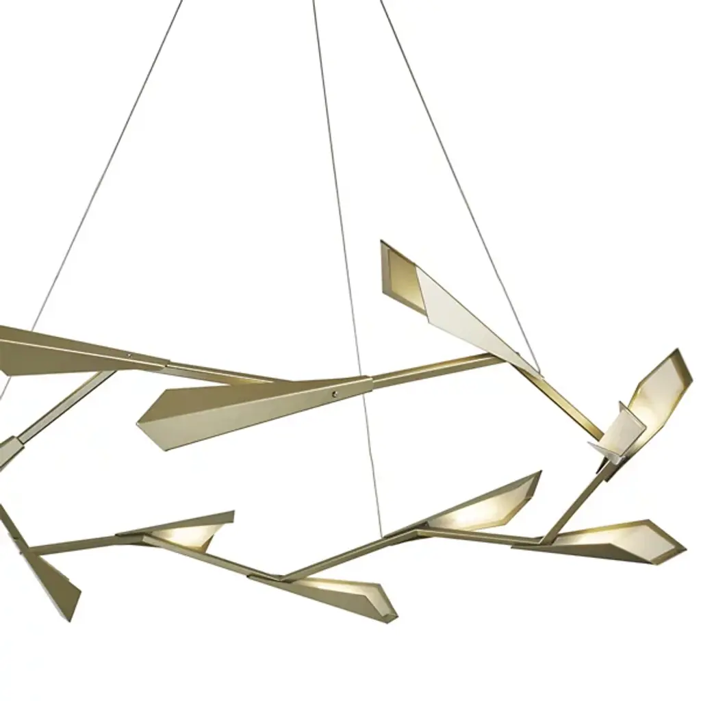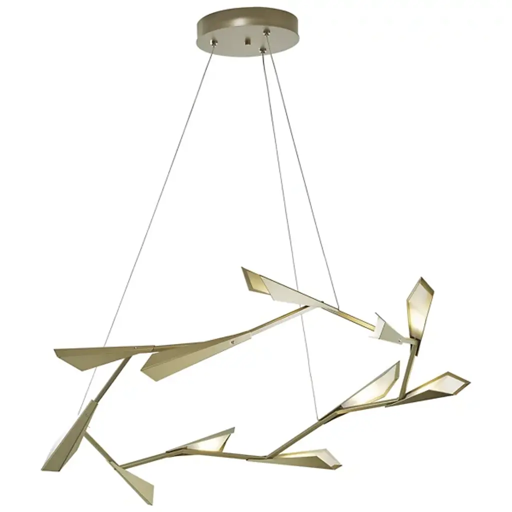 Modeled after an antiquated writing tool, The Hubbardton Forge Quill Large LED Pendant blends new technology with ancient writing practices. The aluminum "quills" link together uniquely to create an intriguing geometric shape that is powered with energy efficiency. The illumination is diffused through a small acrylic shade on the broad end of each quill, creating a lit environment with an artistic aesthetic.