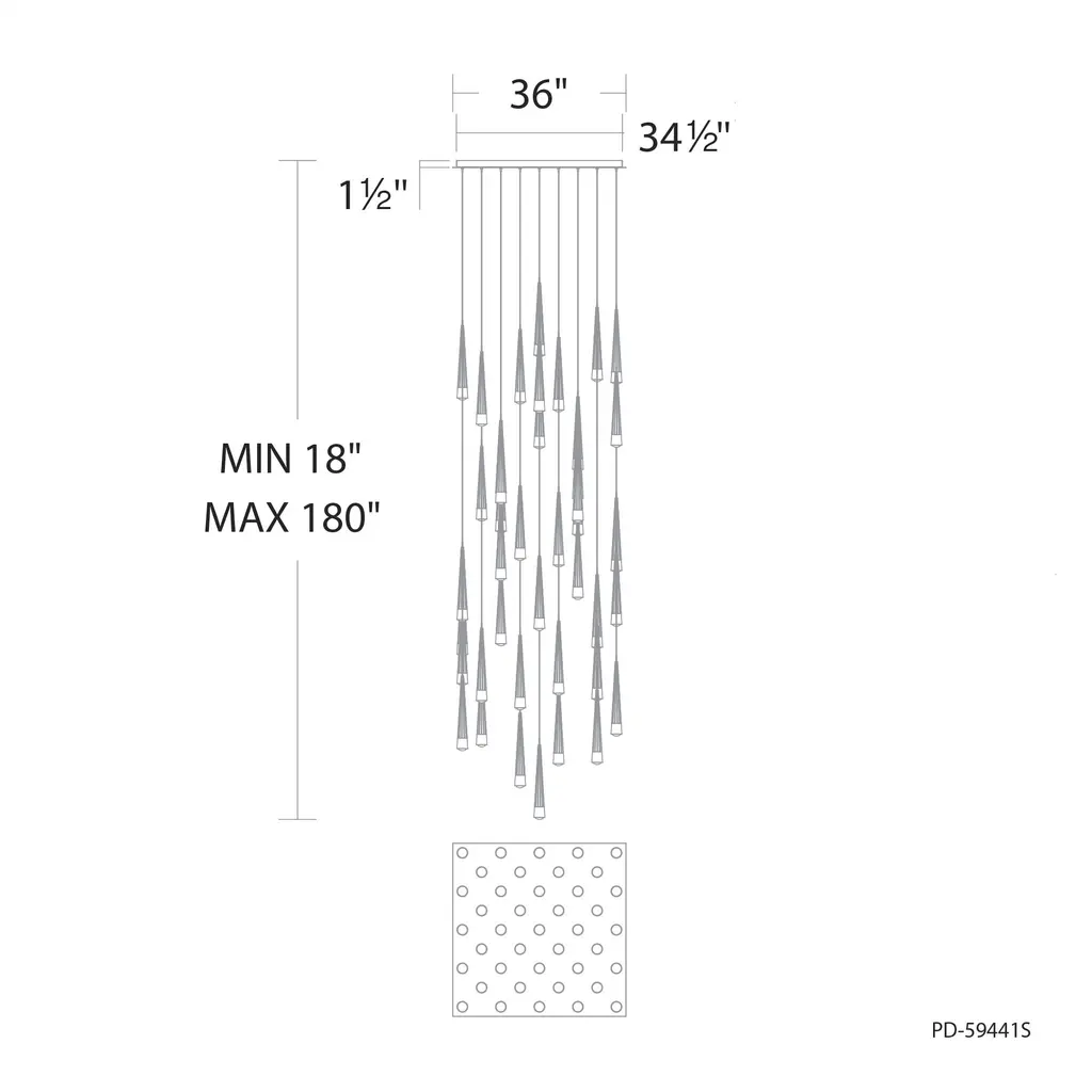 Precisely lined. V-groove flared glass radiates a prismatic glow. Staggered elements create a sense of motion, heightening the drama of this statement piece.