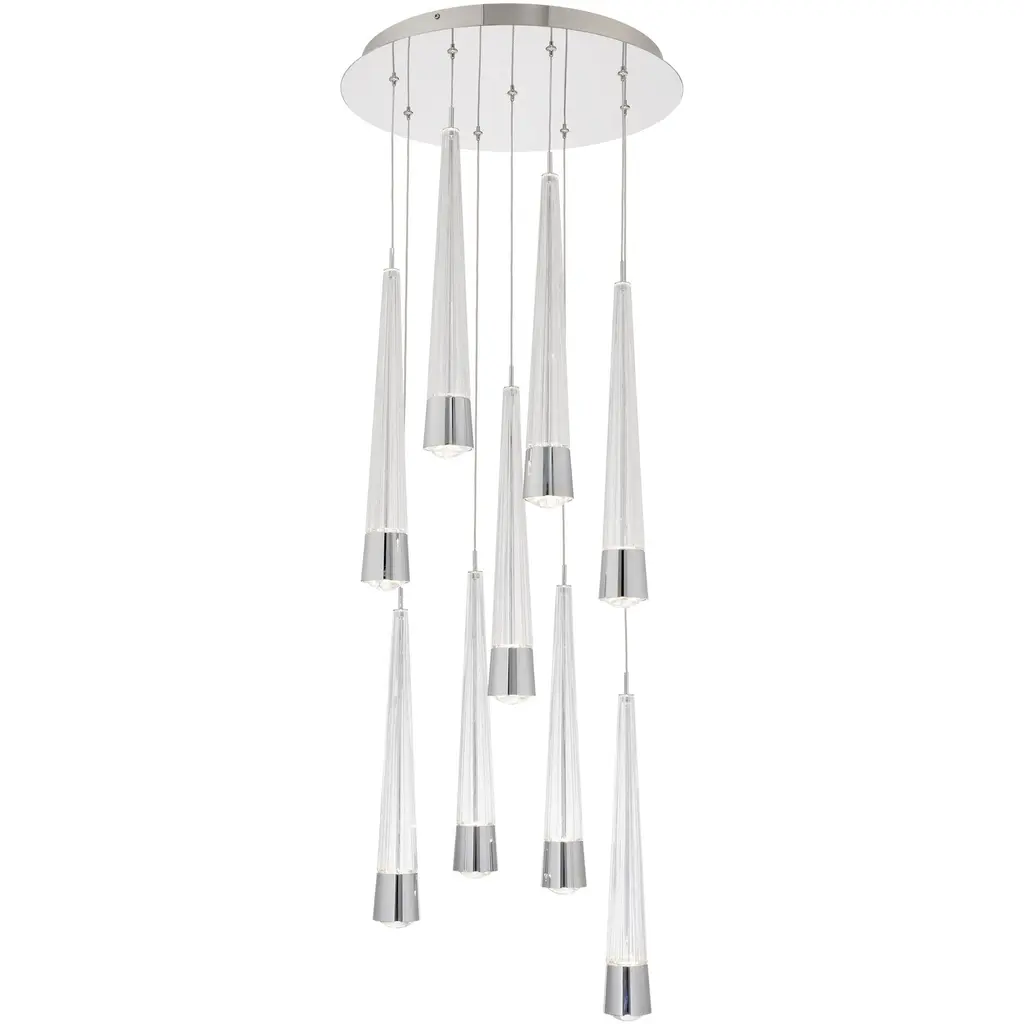 Precisely lined. V-groove flared glass radiates a prismatic glow. Staggered elements create a sense of motion, heightening the drama of this statement piece.