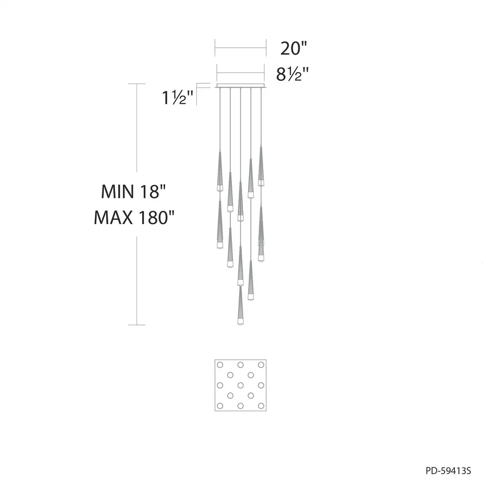 Precisely lined. V-groove flared glass radiates a prismatic glow. Staggered elements create a sense of motion, heightening the drama of this statement piece.