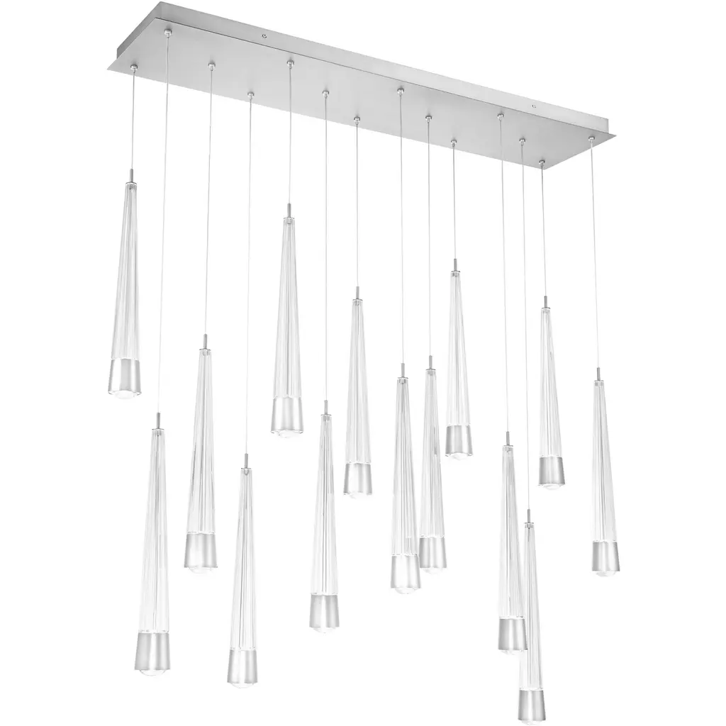 Precisely lined. V-groove flared glass radiates a prismatic glow. Staggered elements create a sense of motion, heightening the drama of this statement piece.