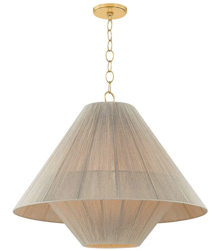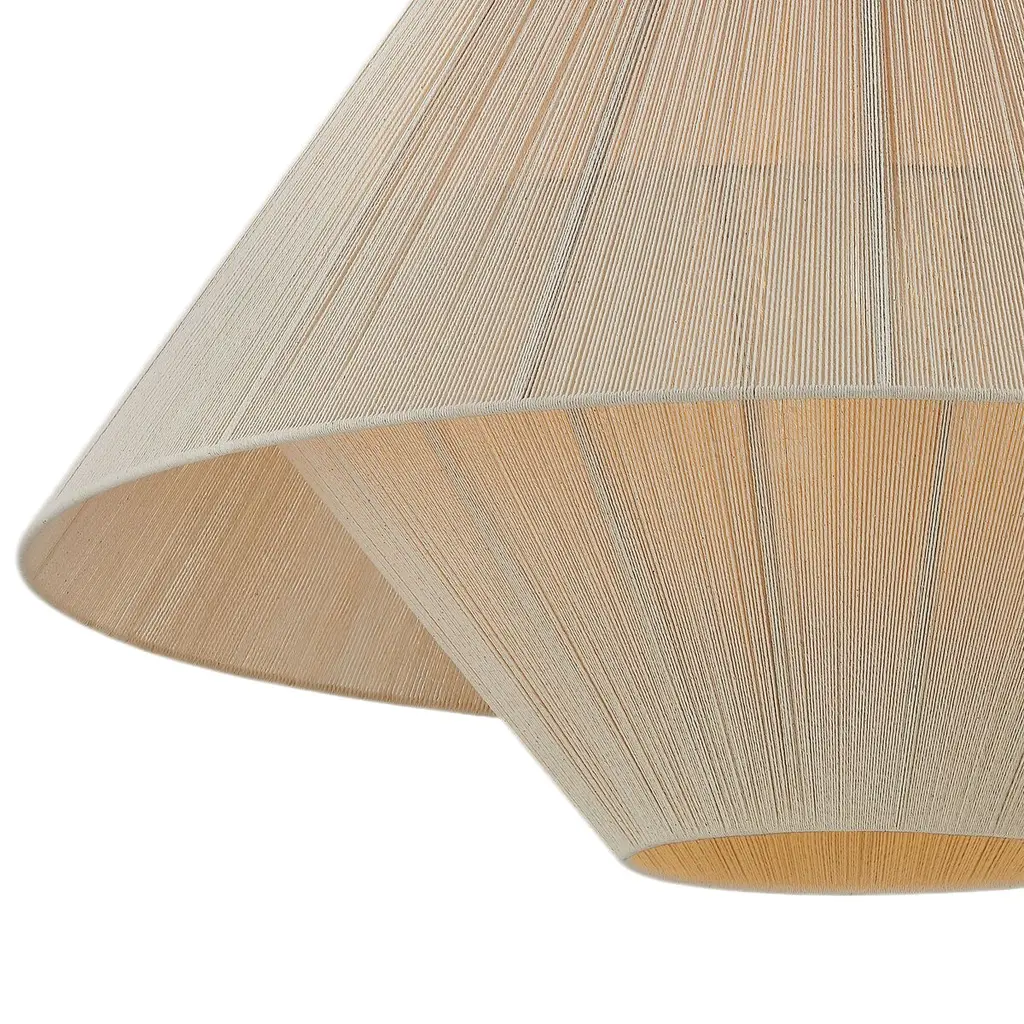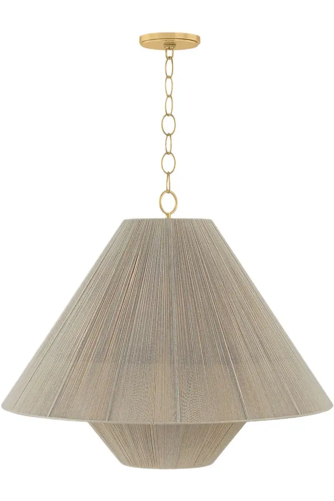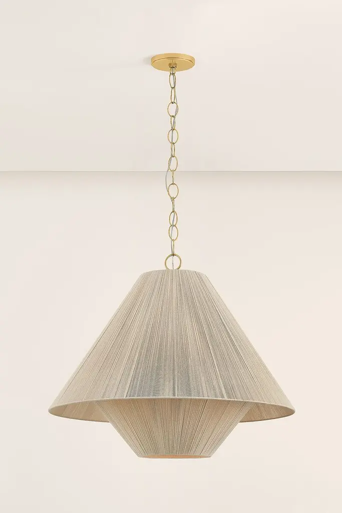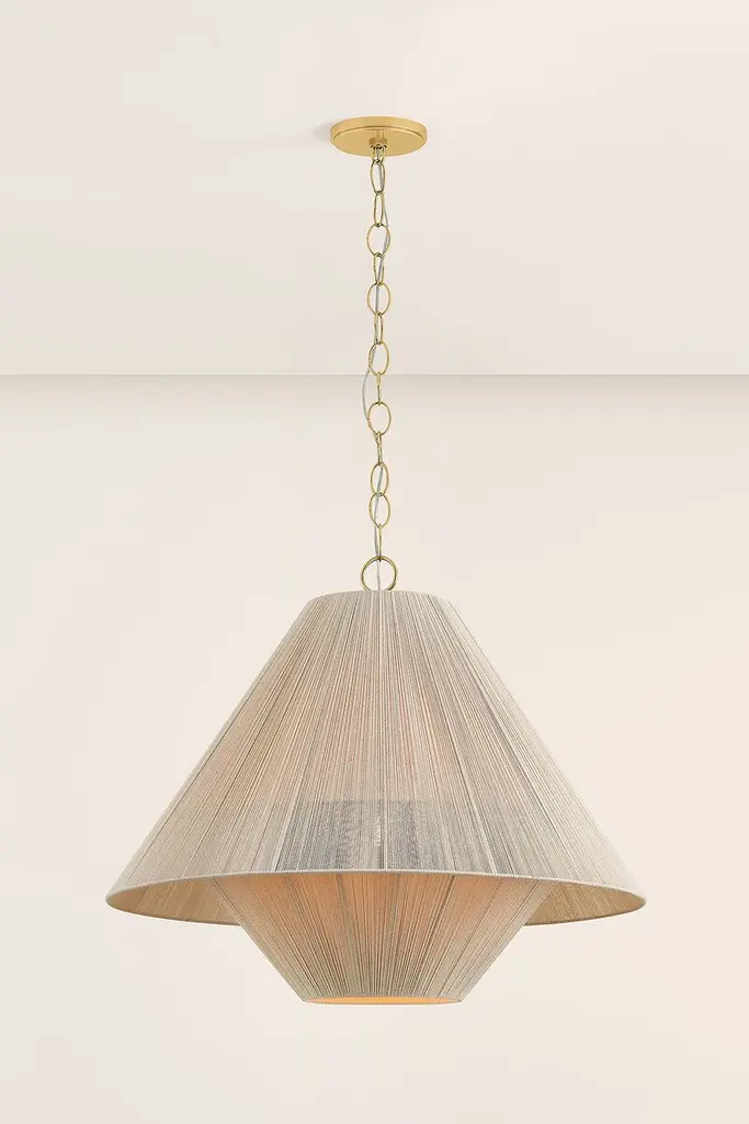 To create the casual elegance of the Quorin pendant, two light and airy string shades are nested around a central light source. The overlapping of the conical shades creates a subtle moire effect, adding depth to the dynamic silhouette. Suspended by a simple, yet refined chain, Quorin is perfect over a dining table or in a bedroom.