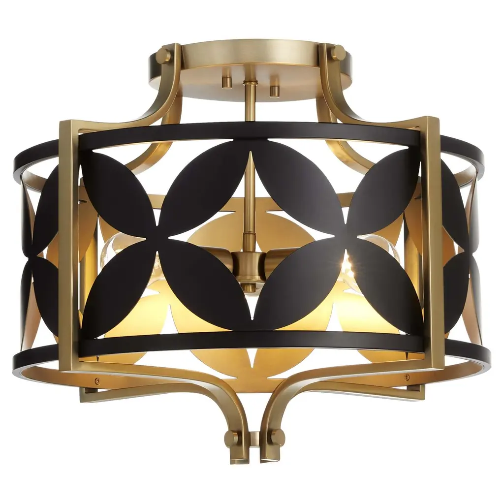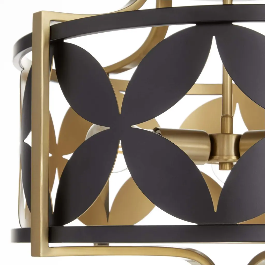 The Mariposa series is embellished with a repeating geometric floral pattern of matte black metal petals. These pieces contrast beautifully with aged brass frames. Exposed lamps enhance the collection's artful aesthetic and allow the light to interact with the decorative pattern, casting intricate shadows and creating a dynamic lighting effect. The overall design of the series, with its blend of shapely patterns and elegant finishes, makes it a perfect focal point for spaces such as dining rooms, living rooms, or entryways. Choose from a selection of ceiling mount, vanity, or pendant designs.Features:Dimensions:Electrical Specifications: