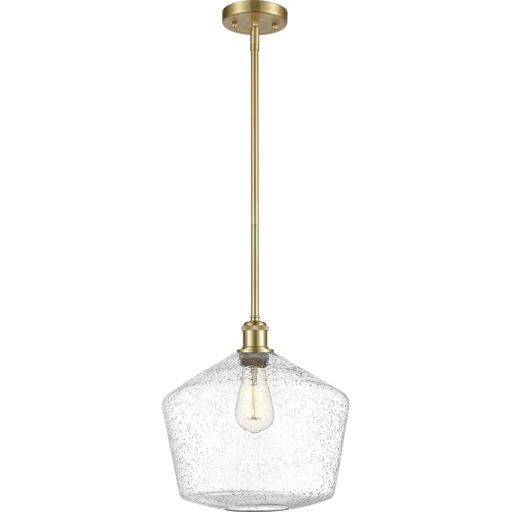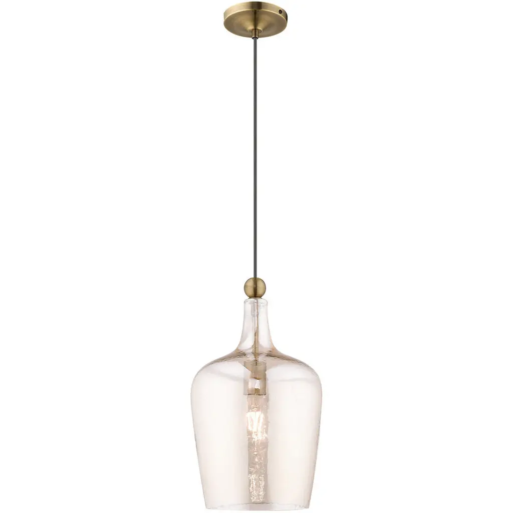 Material: Glass, Finish Color: Aged Brass, Width: 10", Height: 17.5", Hanging Method: Cord, Number Of Bulbs: 1, Wattage: 60 Watts, Dimmable: No, Moisture Rating: Damp Rated, Desc: 10 Inch 1 Light Pendant A great complement to any style, this clear hammered glass pendant will cast a luminous glow on your space. Supplied with ten feet of cord, for adjustability to varying ceiling heights. The Satin Nickel finish is a great pairing with the artful look. A medium base, 60W bulb is all you need to complete the look. Features: Product Type: Pendant / Style: Transitional / Finish: Satin Nickel / Shade Color: Clear . ,