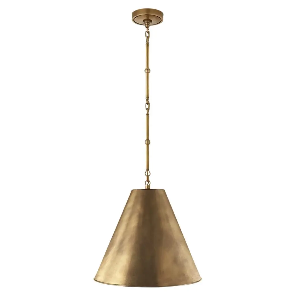 Finish Color: Artisans Brass, Width: 13.25", Height: 23", Hanging Method: Chain, Chain Length: 96", Lamping Type: Incandescent, Number Of Bulbs: 1, Wattage: 40 Watts, Moisture Rating: Dry Rated, Desc: With industrial appeal, this artisan brass and wood pendant is just the lighting solution that you need for your modern farmhouse design. Formed into a bell-shape with decorative wooden fitter, this fixture is the epitome of modern-nostalgia. Fit for a single medium based 40W bulb, this pendant is ideal for any rural or industrial leaning living room, kitchen or dining room space. ,