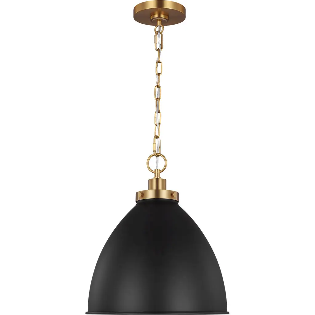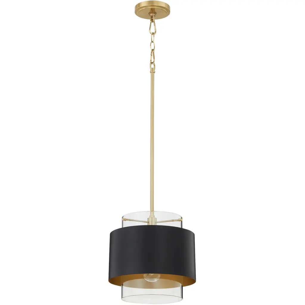 Finish Color: Noir/Aged Brass, Width: 8", Height: 14", Hanging Method: Rod and Chain, Number Of Bulbs: 1, Wattage: 100 Watts, Dimmable: No, Moisture Rating: Damp Rated, Desc: 1 Light Cylinder Pendant This eclectic one light pendant is the perfect lighting solution for any industrial-modern or nostalgic-transitional space. The two-tiered drum shade sports an opaque white finish on the outer layer, coupled with a classic Aged Brass finish on the interior layer. A matte white acrylic diffuser, and a matching Aged Brass chain and stem hanging system complete the look. Hang multiples over your modern farmhouse kitchen island for an outstanding design, or line your hallway with these luminaries for an exceptional ambient glow. Features: Product Type: Pendant / Style: Soft Contemporary / Finish: Studio White / Aged Brass / Bulb Type: A Type . ,