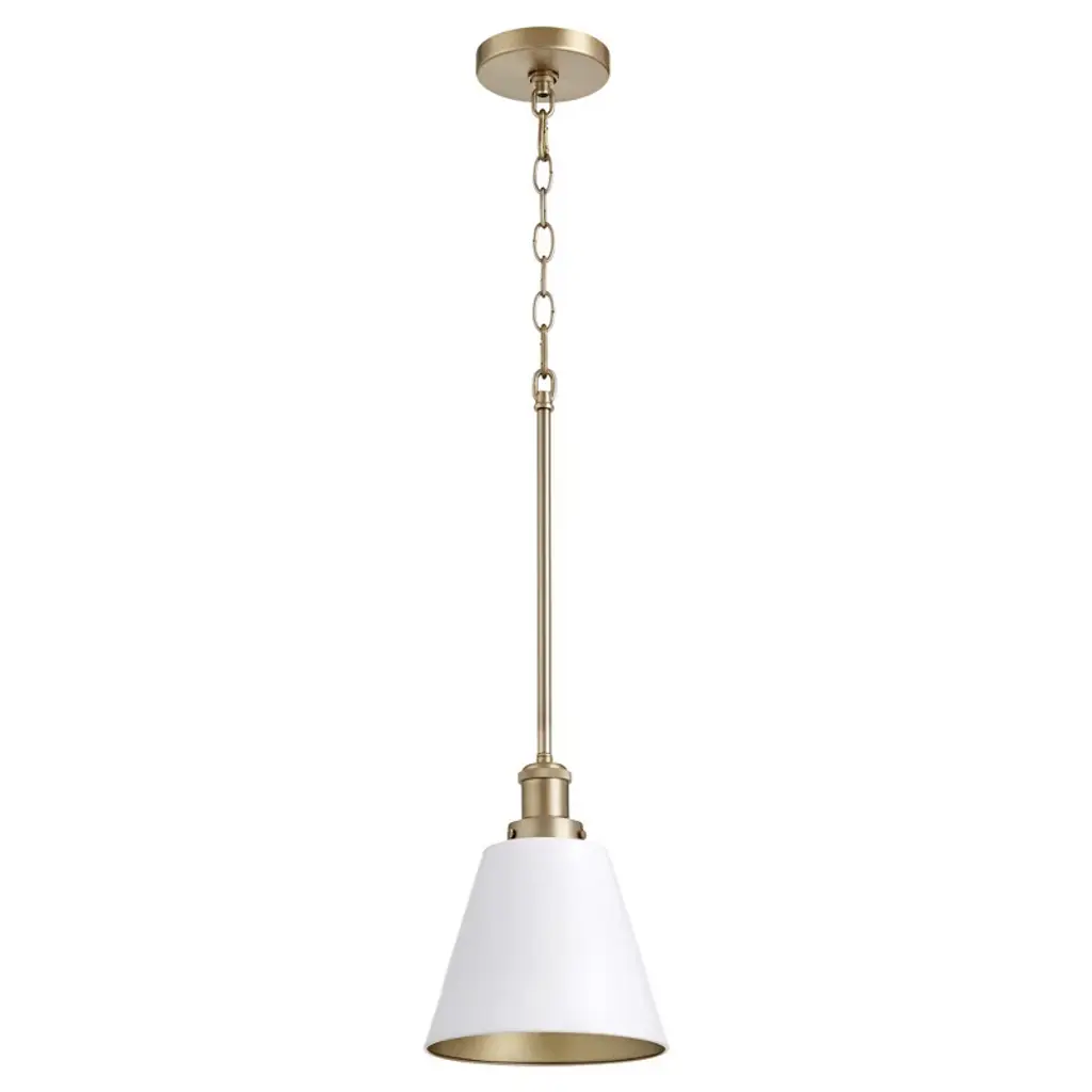Material: Metal, Finish Color: Noir/Aged Brass, Width: 11.75", Height: 10", Hanging Method: Rod and Chain, Chain Length: 12", Lamping Type: Incandescent, Number Of Bulbs: 1, Wattage: 100 Watts, Dimmable: No, Moisture Rating: Damp Rated, Desc: 11.75 Inch 1 Light Dome Pendant This eclectic one light pendant is the perfect lighting solution for any industrial-modern or nostalgic-transitional space. The dome shaped shade sports an opaque white finish on the exterior, coupled with a frame-matching, Aged Brass finish on the interior. A decorative cast fitter, and a matching Aged Brass chain and stem hanging system complete the look. Hang multiples over your modern farmhouse kitchen island for an outstanding design, or line your hallway with these luminaries for an exceptional ambient glow Features: Product Type: Pendant / Style: Transitional / Mounting: Chain: 1 Foot & Rods: Two 8", Two 12" & Two 16" | Vaulted and Sloped Ceiling Adaptable . ,