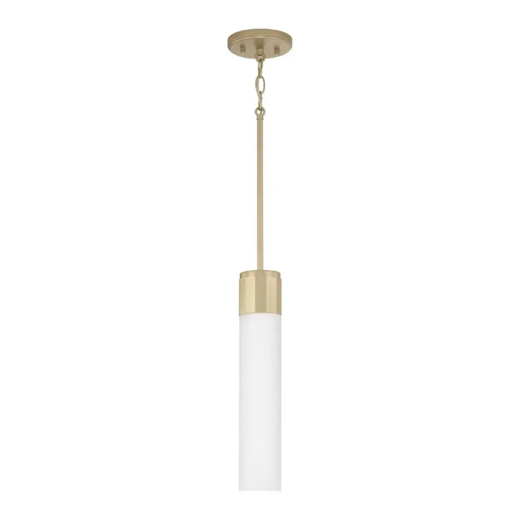 Finish Color: Studio White/Aged Brass, Width: 8", Height: 14", Hanging Method: Rod and Chain, Number Of Bulbs: 1, Wattage: 100 Watts, Dimmable: No, Moisture Rating: Damp Rated, Desc: 1 Light Cylinder Pendant This eclectic one light pendant is the perfect lighting solution for any industrial-modern or nostalgic-transitional space. The two-tiered drum shade sports an opaque white finish on the outer layer, coupled with a classic Aged Brass finish on the interior layer. A matte white acrylic diffuser, and a matching Aged Brass chain and stem hanging system complete the look. Hang multiples over your modern farmhouse kitchen island for an outstanding design, or line your hallway with these luminaries for an exceptional ambient glow. Features: Product Type: Pendant / Style: Soft Contemporary / Finish: Studio White / Aged Brass / Bulb Type: A Type . ,