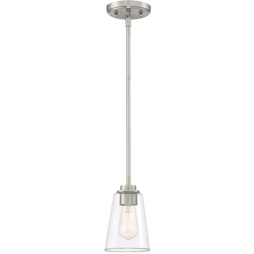 Introducing the Jardin One Light Pendant by Quorum Lighting. This sleek pendant features a Satin Nickel finish, adding modern elegance to any space. With a width of 5.5" and a height of 6.5", it's perfect for smaller areas or as a stylish addition to a larger room. The stem hanging method ensures a secure installation. The Jardin Pendant accommodates one bulb up to 100 Watts for ample illumination. Please note it is not dimmable. With a damp rating, it's suitable for bathrooms or covered outdoor spaces. The Clear seeded shade adds texture and visual interest. The Jardin One Light Pendant by Quorum Lighting is a versatile and durable lighting solution. Elevate your home decor with this stylish pendant.
