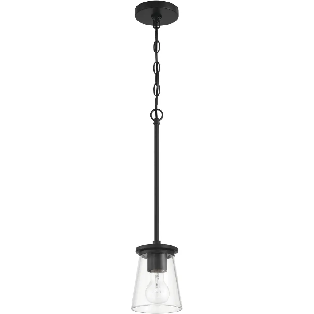 Collection: Lazo, Finish Color: Textured Black, Width: 5.25", Height: 8.25", Hanging Method: Rod and Chain, Chain Length: 12", Lamping Type: Incandescent, Number Of Bulbs: 1, Wattage: 100 Watts, Moisture Rating: Damp Rated, Desc: This transitional, single-light pendant boasts a noir finish on its slender frame. With ample illumination for your daily needs, this fixture will add a layer of contemporary styling to your home's decor. With a modernized silhouette, this lighting collection boasts cylindrical, chiseled glass shades for a soft diffusion of light. The Lazo series is supplied with interchangeable noir, satin nickel, and aged brass socket cup decos to customize the look within your space. ,