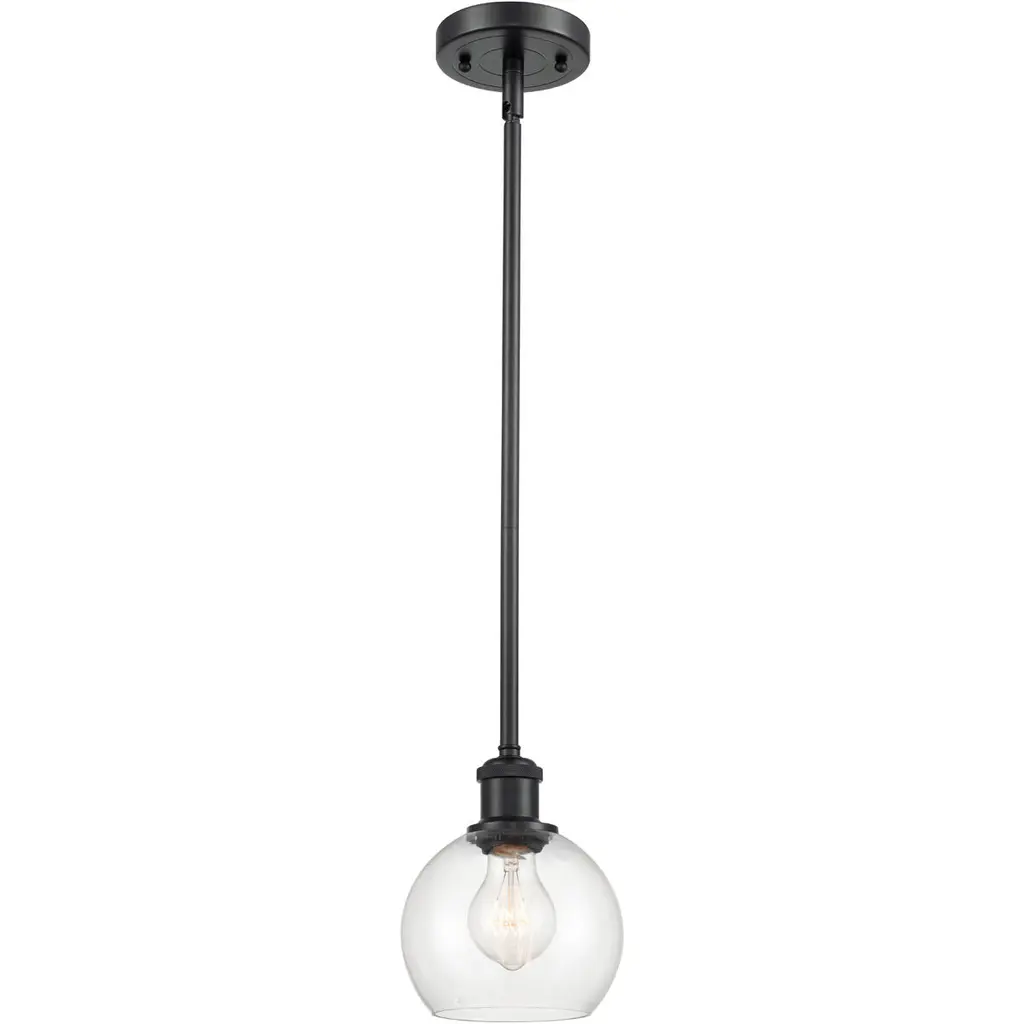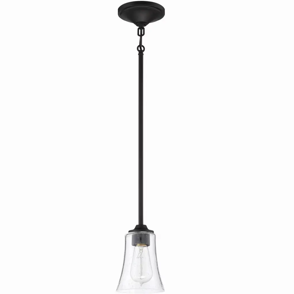 Collection: Reyes, Finish Color: Textured Black, Width: 5.25", Height: 8.75", Hanging Method: Stem, Lamping Type: Incandescent, Number Of Bulbs: 1, Wattage: 100 Watts, Moisture Rating: Damp Rated, Desc: The Reyes series features styles centered on clean-lined, versatile, and elegant designs. These transitional pieces blend with most aesthetics, yet they are sleek enough to stand out in any space. With so much versatility in one collection, the Reyes series is an easy choice for any new space or redesign. Requires 1 - 100 Watt / Medium Base Bulb / Clear Seeded Glass Shade / Damp Listed. ,