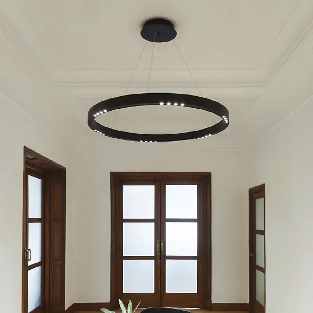 The R2 LED Pendant by B.Lux has a clean, crisp composition that reflects the frank and functional way that designer David Abad creates pieces. Suspended from thin cables for an airy feel, a simple aluminum halo houses a collection of evenly spaced and thoughtfully gathered light sources. A uniform finish keeps this design sleek and tailored, allowing its minimal nature to work well in a variety of locations, providing a welcoming wash of energy-efficient illumination to its surroundings.