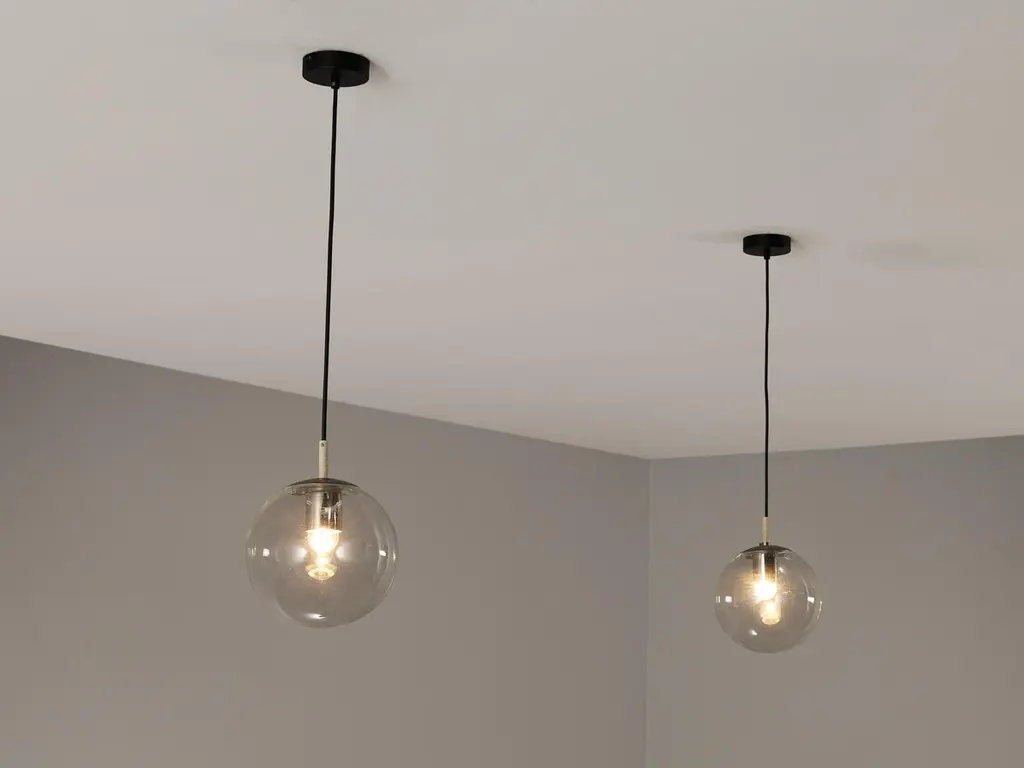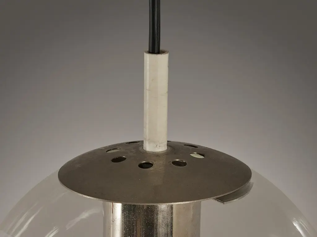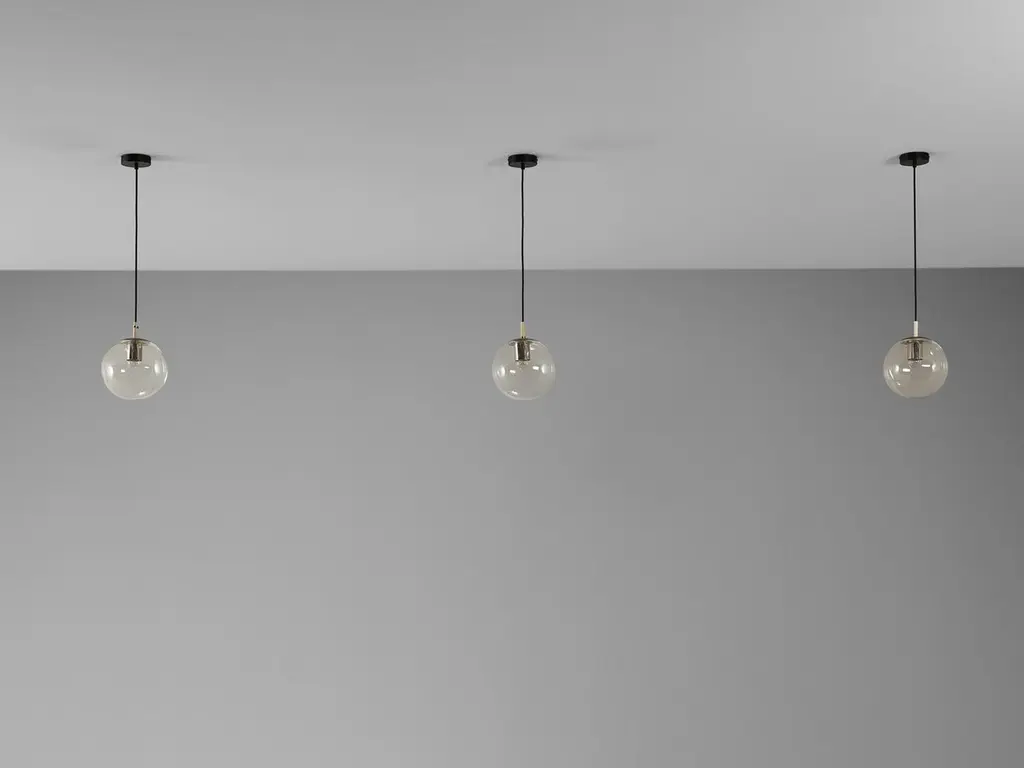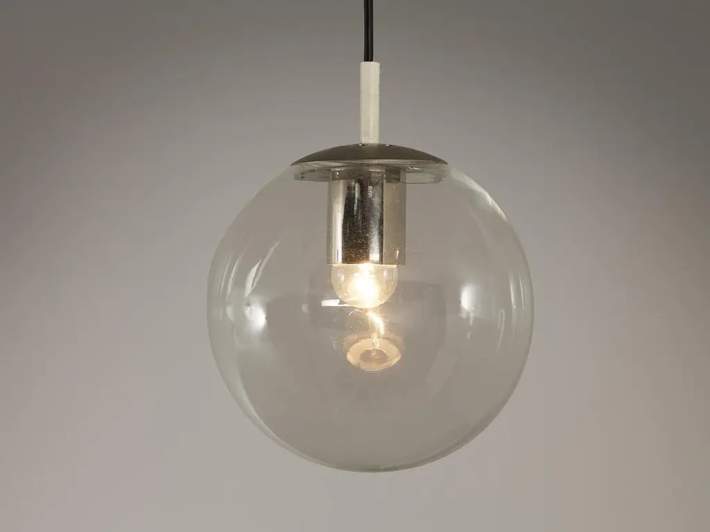 RAAK Amsterdam, pendants, glass, metal, Europe, 1970s.This atmospheric set of pendant lamps features each a glass orb, casting a gentle and soothing light tone that imbues the space with a vibrant atmosphere. The lamps can be hung above a large dining table as a set or in an entranceway in order to make an impression, or serve as a way to enlighten any interior in a fine manner.Please note that this item is in used condition. For further details, we encourage you to reach out to our team of design specialists.
