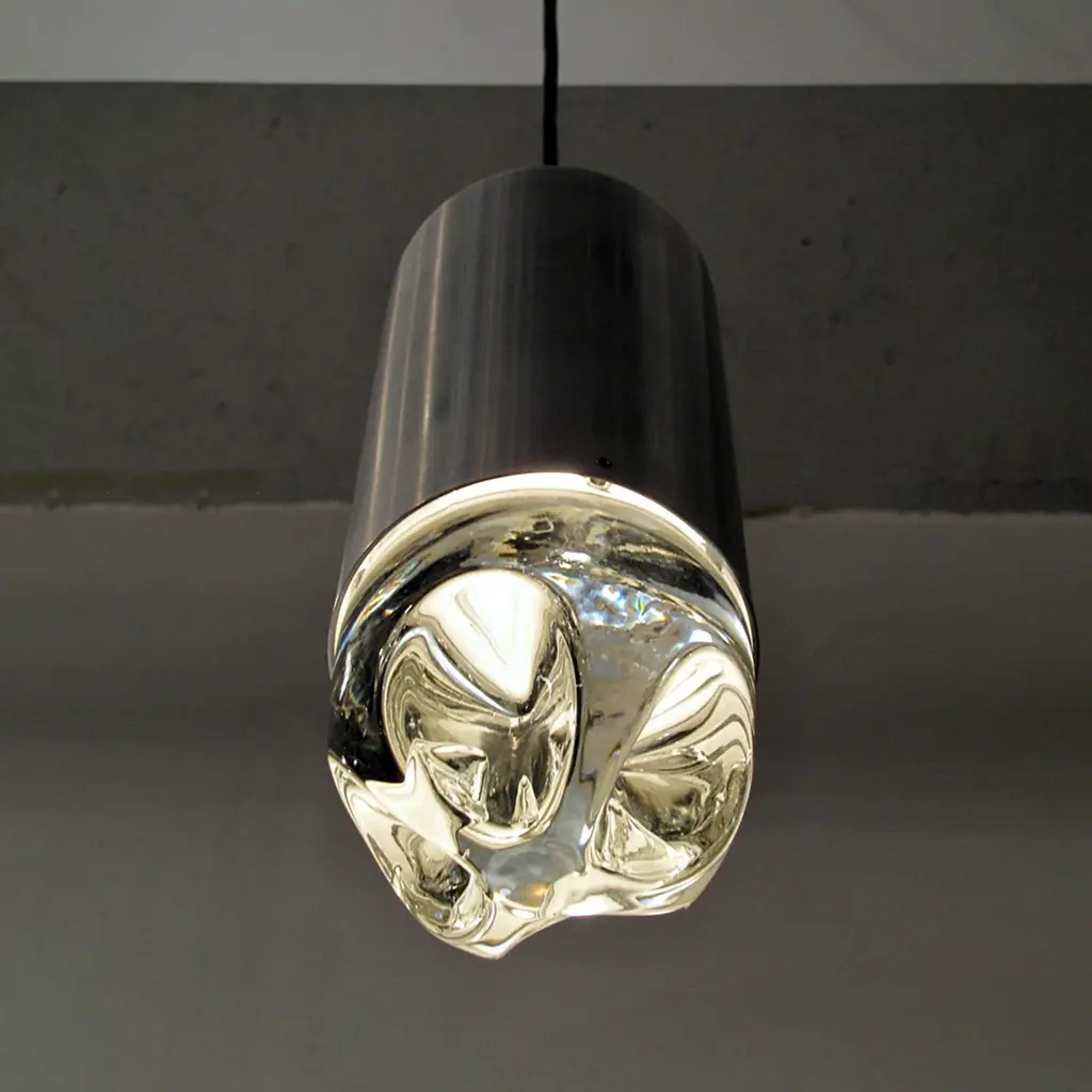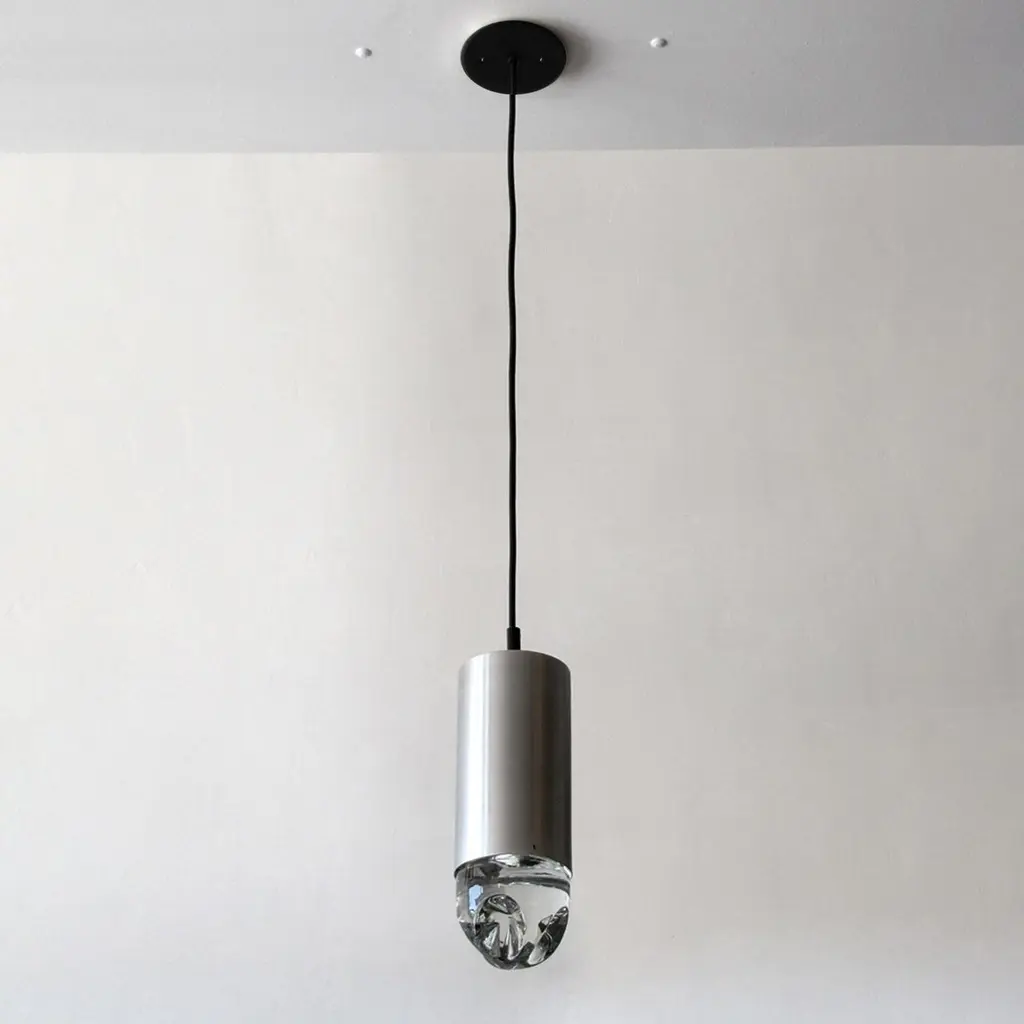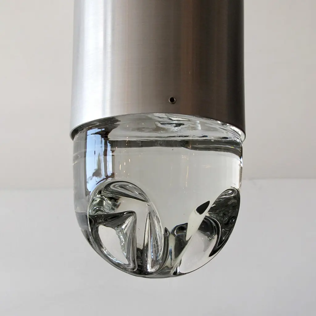 Stunning pendant lights with solid glass bodies suspended from an aluminum cylinder by RAAK, Holland, total drop is fully adjustable on request, wired for US standards, one E27 socket, max. wattage 60w each or LED equivalentPriced individually.