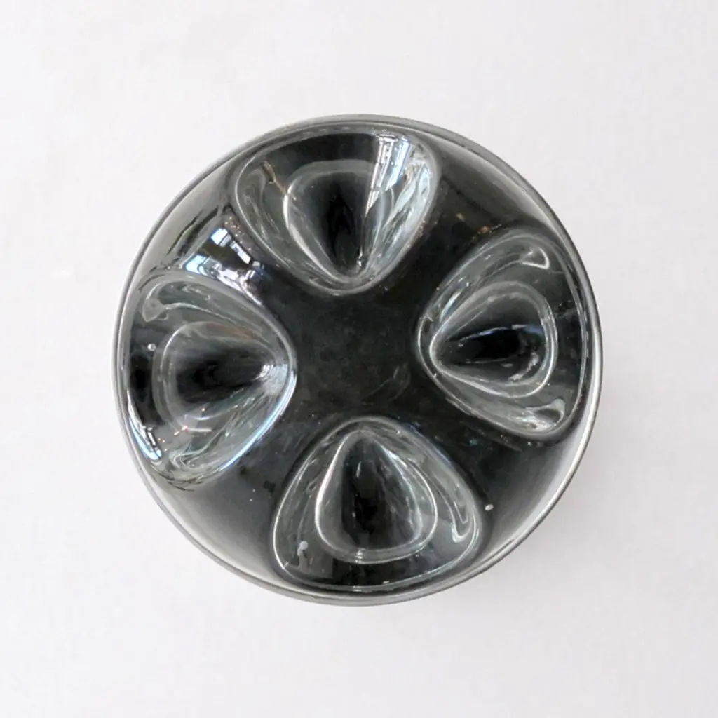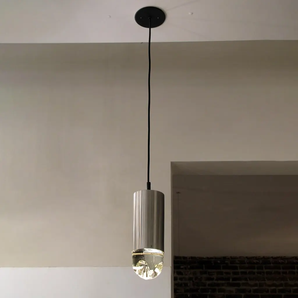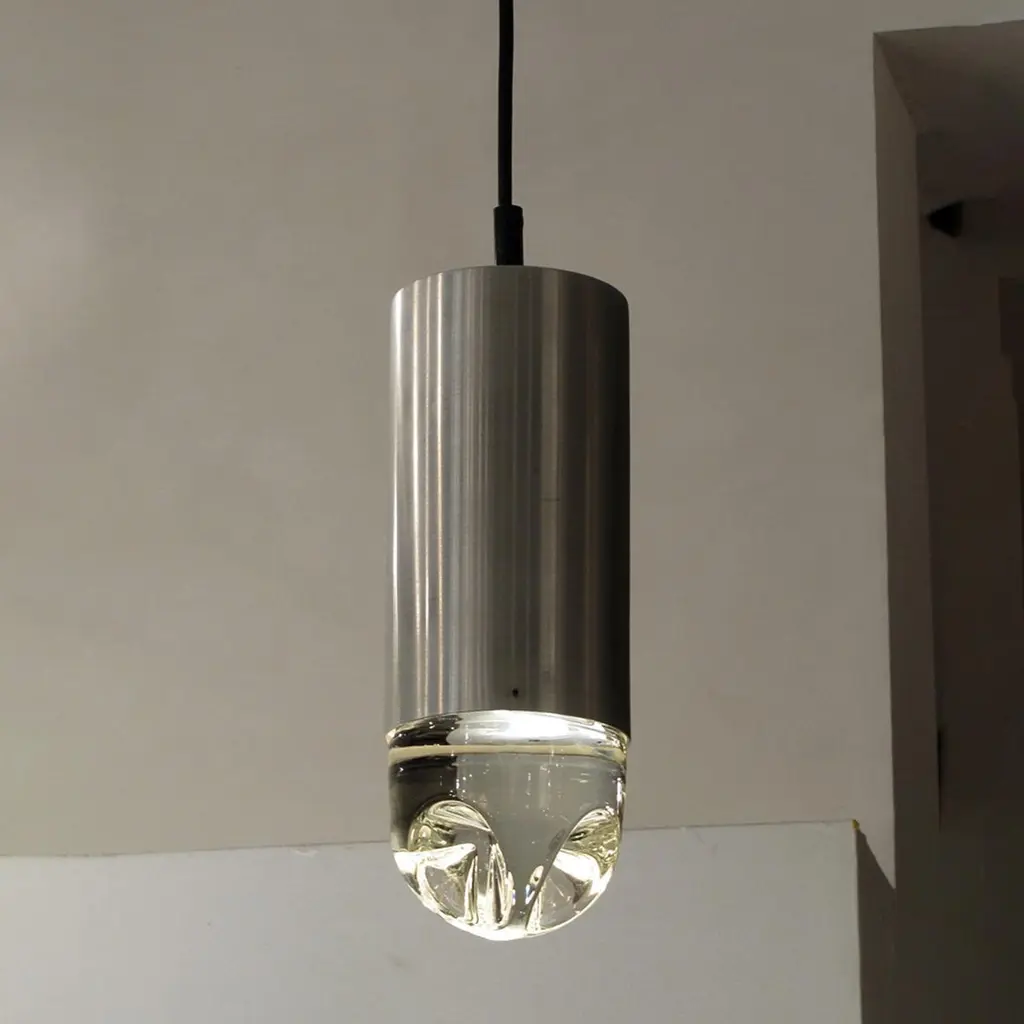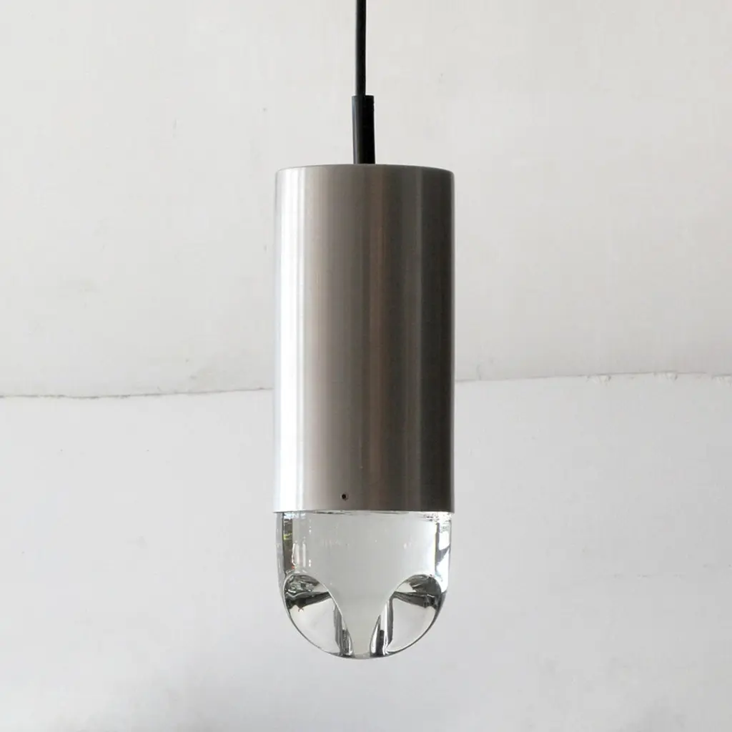 Stunning pendant lights with solid glass bodies suspended from an aluminum cylinder by RAAK, Holland, total drop is fully adjustable on request, wired for US standards, one E27 socket, max. wattage 60w each or LED equivalentPriced individually.