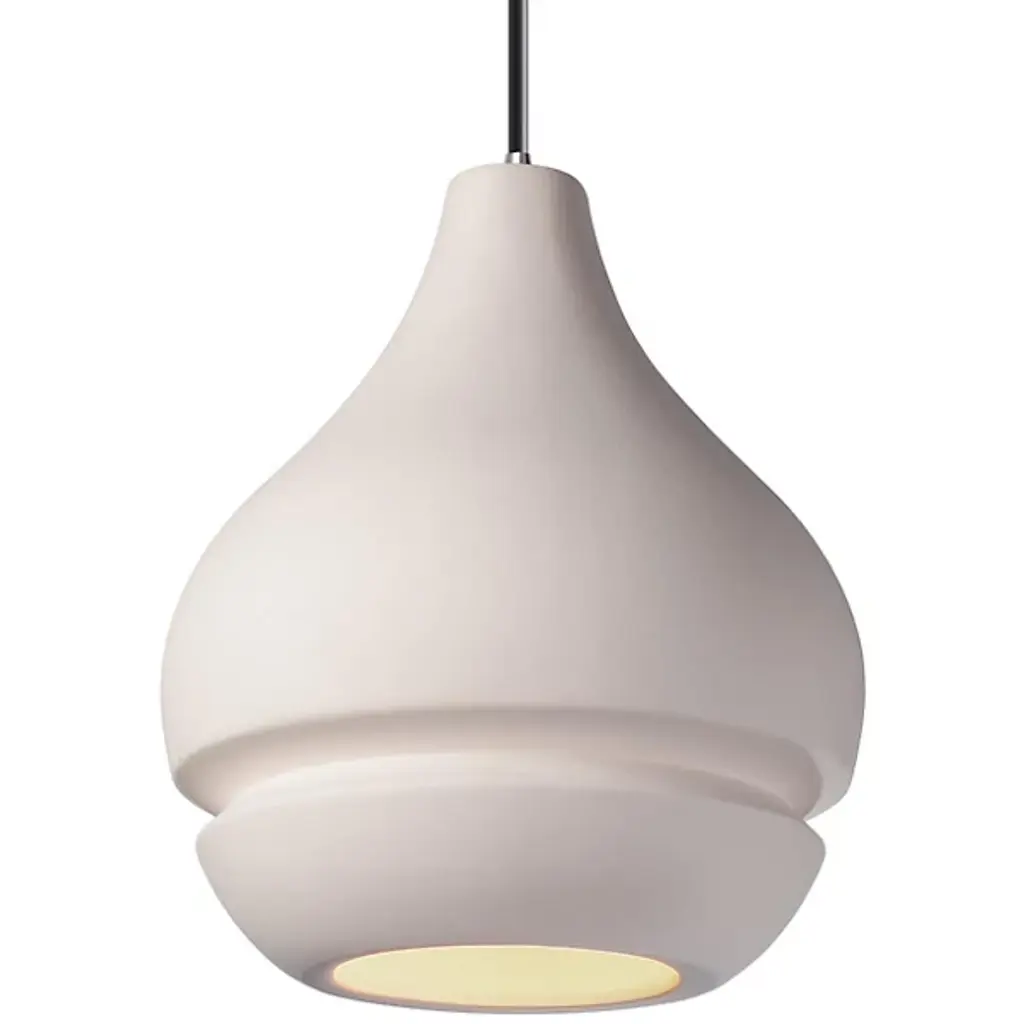 Middle Eastern motifs, updated with a modern sensibility. Justice Design’s Radiance Arabesque Mini Pendant is handcrafted in the United Sates, of Ceramic in an evocative teardrop profile. Dangling dramatically from a long cord, its gently curved contours are cut through with a crisp channel, a clean, contemporary contrast to the decorative form. The pendant infuses living spaces with an exotic, yet modern feel and can be displayed alone or in a group for maximum impact.
