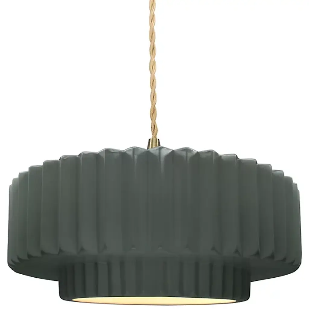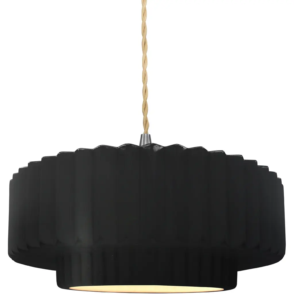 Brighten your space with modern sophistication with the installation of Justice Design's Radiance Tier Pleated Pendant. Ideal for illuminating your kitchen or dining area, this chic pendant light fosters a welcoming ambiance. Its contemporary design seamlessly merges style and functionality, making it a superb fit for any modern setting. Crafted from durable ceramic, it ensures longevity and enduring charm. Versatile enough to serve as a focal point in any room, this pendant from Justice Design delivers a stunning lighting solution that effortlessly marries style with practicality.